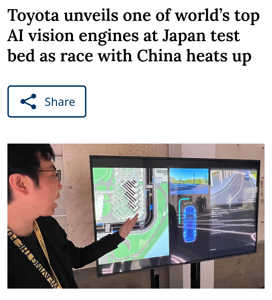 >Toyota Motor Corp. deployed what it calls one of the world’s leading video-based artificial intelligence systems as the Japanese carmaker races to catch up with Chinese rivals in AI-powered mobility technologies.>The Woven City AI Vision Engine, unveiled April 22 at Toyota’s technology test bed near Mount Fuji, uses cameras and sensors to process visual data for autonomous driving, robotics and manufacturing applications.>The approach synergizes visual, behavioral and environmental data to identify risks, detect patterns, control coordinated actions and make predictions. Toyota Motor Corp. touts its technologies as one of the world’s leading vision language models, citing an evaluation by MVBench Leaderboard, a benchmark for evaluating video-based AI comprehension and analysis.>Toyota’s vision AI system marks an important step in bridging the physical and digital worlds, with applications in autonomous driving, robotics and manufacturing. The technology leverages visual images without human input to understand and interact with its environment. https://www.autonews.com/toyota/an-toyota-woven-city-vision-ai-artificial-intelligence-ev-mobility-daisuke-toyoda-0422/