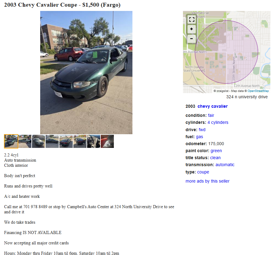 I feel like I'm committing a car sin but not sure where to ask. I know this is fairly stupid but I want to know how stupid this actually is. Basically, I am an idiot and didn't realize winter in Fargo starts as soon as next week and goes till mid April supposedly. Took a job up here because it paid good, cost of living is insanely cheap, and only needed 1 day in the office a week and turns out uber gets insanely expensive in winter. However, I'm still in the "training and probation" till February...Looking at picrel, underbody isn't rusted out. Drives... fine... Dealer is willing to do 1500 for tax/tags out the door. This state only requires getting insurance which should be practically nothing given I can pay in full cash. Really only need something to get me around 10 miles a day Mon->Fri.On a scale of 0 to full retard, what do you guys think.