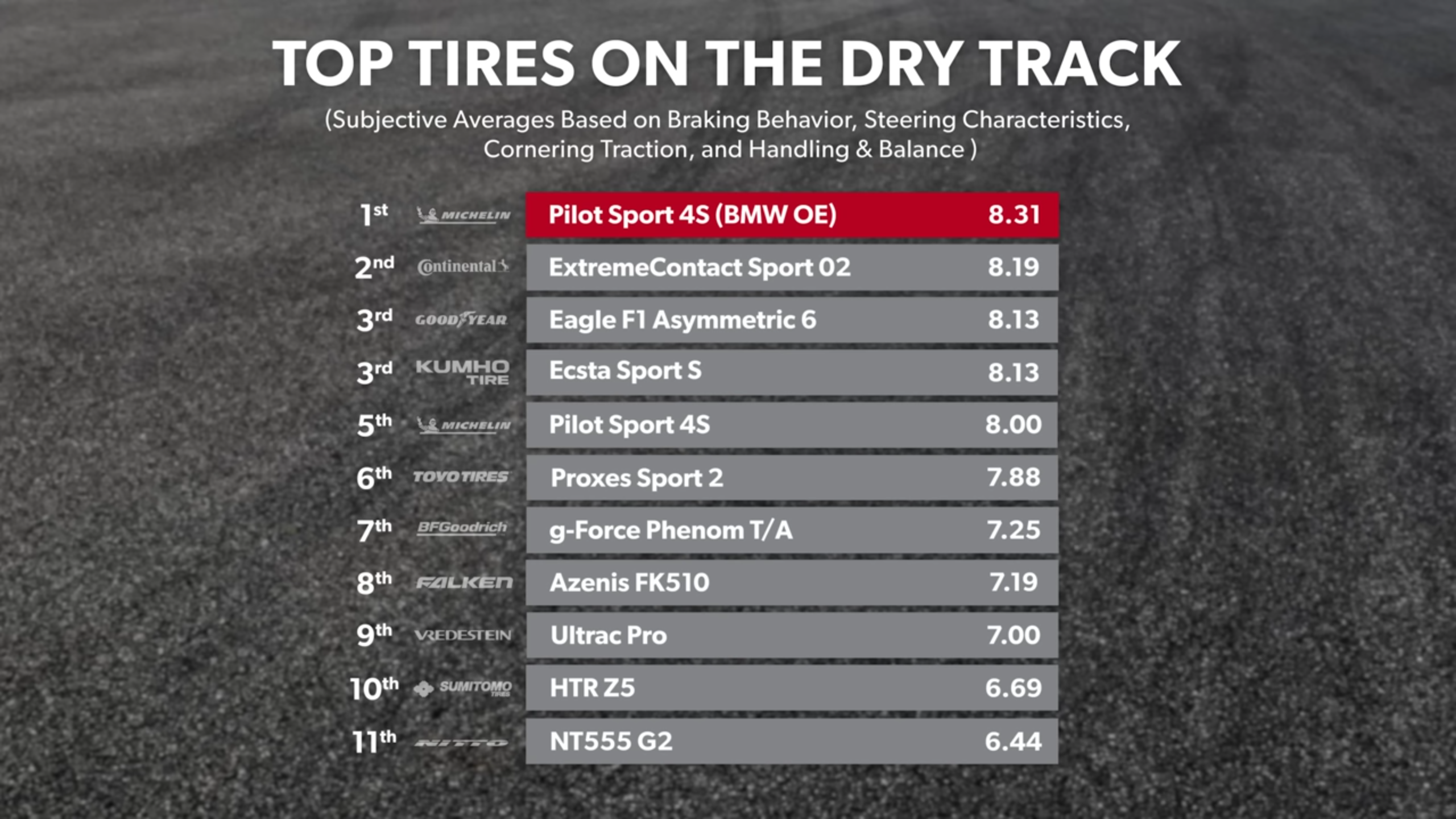 >>28682684https://www.tire-reviews.com/Tire-Tests/2025-Al-Volante-Summer-Tire-Test.htmhttps://www.youtube.com/watch?v=TQsWlZoh55Uhttps://www.youtube.com/watch?v=t10y-87oiD4https://www.youtube.com/watch?v=QRR806kP6ZU https://www.youtube.com/watch?v=wPKuFEoh76I https://www.youtube.com/watch?v=v1CzPuDnnK0https://www.youtube.com/watch?v=j7xROFzVFWUhttps://www.youtube.com/watch?v=rocBhnxkf38Any of SportContact 7/ExtremeContact Sport 02/Eagle F1 Supercar 3/Cinturato C3, and ExtremeContact DWS06+/PZero AS Plus 3, respectively.