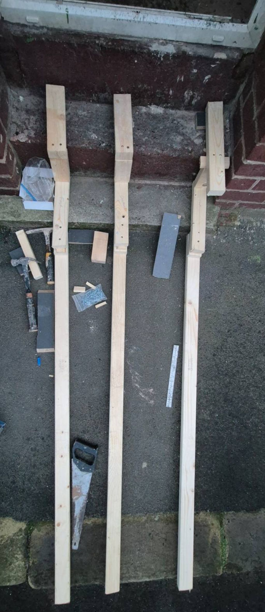 I have started building my ramp. It is going to be great. Solid, light and as wide as the door so I can use the full doorway while manouvering into the house.Last time I used my narrow ramp the bike fell off, it slid and I snapped the brake lever. I basically use first gear and the clutch to keep it in position while permitting some movement. With a long wide ramp it should be much easier.I'll be adding nogs to the joists tomorrow once I am at door height. Then the diagonal beams, struts and then chipboard on top. Wish me luck :)