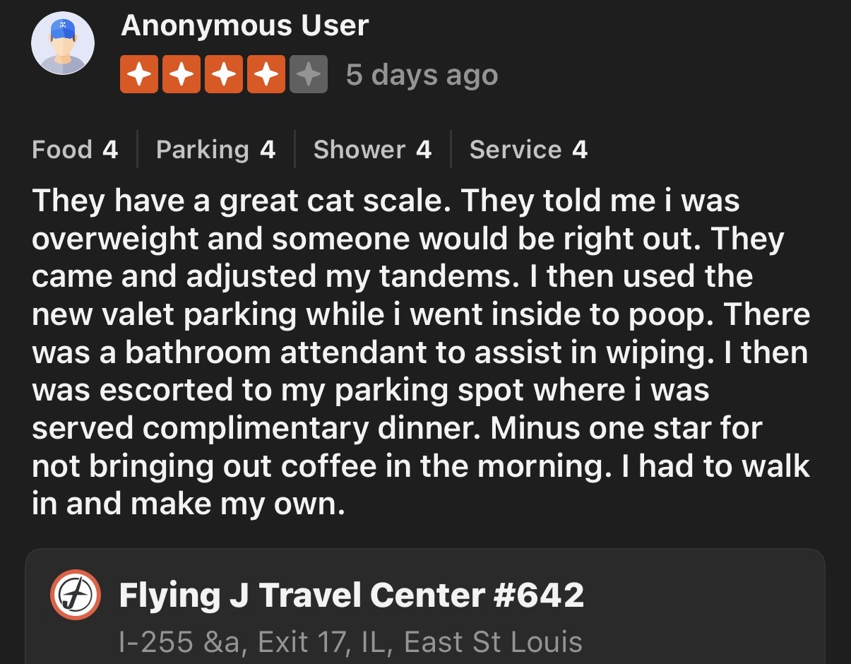 Sounds like a truck stop worth going to.