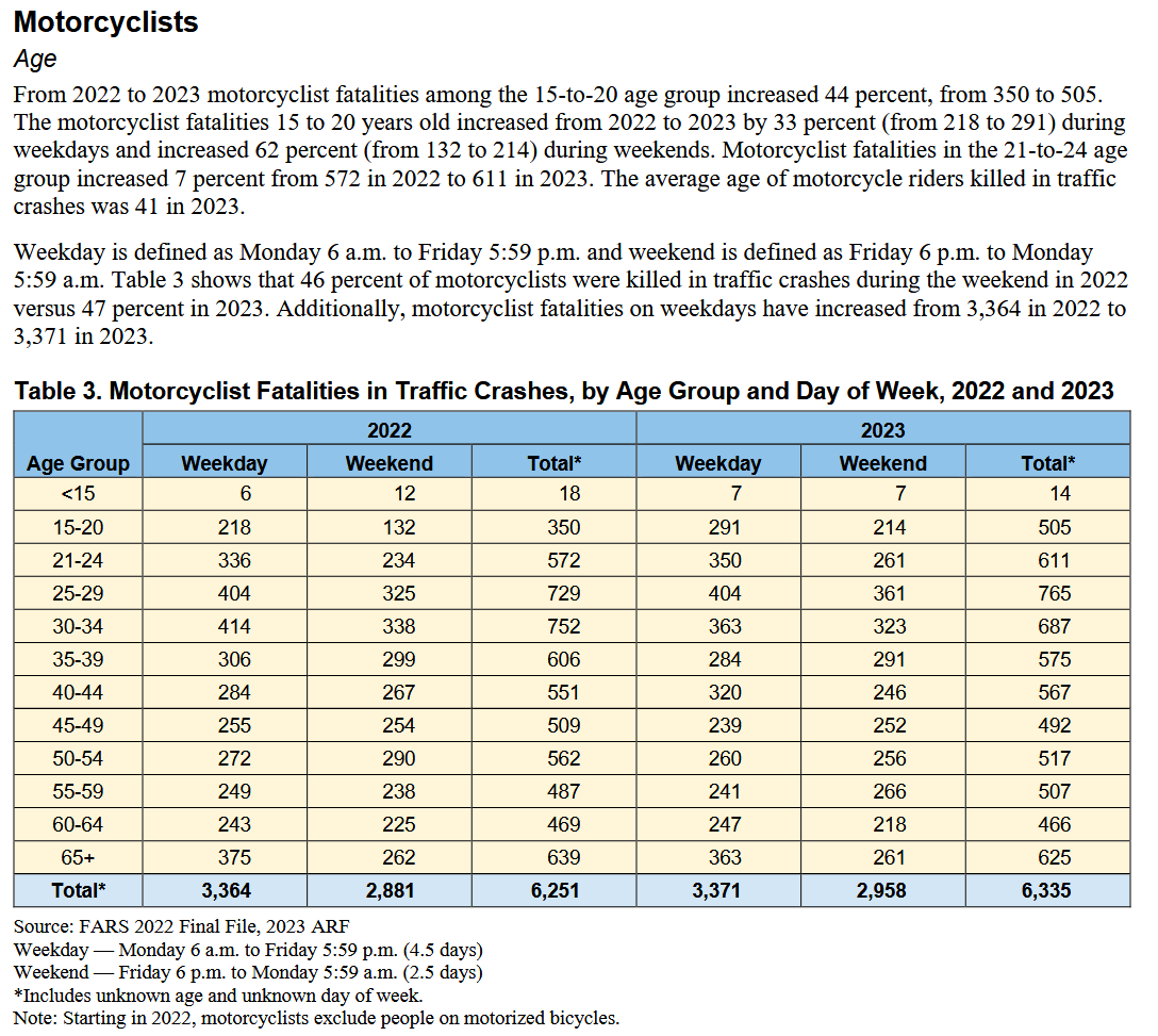 >>28713777>most motorbike fatalities in the US are people who have been riding for less than 3 yearsWe actually have the numbers. A lot of riders are already not getting a license even when its easy.https://crashstats.nhtsa.dot.gov/Api/Public/ViewPublication/813732>2023>6,335 motorcyclists killed>82,564 motorcyclists injured>28 times the passenger car occupant fatality rate.>34% of fatal crashes had no valid motorcycle licenses.>26% alcohol impairment>41% died in single-vehicle crashes were alcohol-impaired.>In States without universal helmet laws, based on known helmet use, 51percent of motorcyclists killed in 2023 were not wearing helmets, ascompared to 10 percent in States with universal helmet laws.