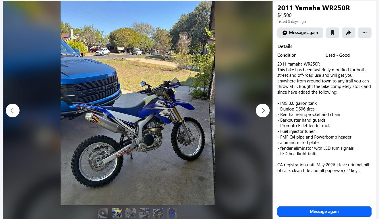 >>28717326i haven't had a bike since i was kid. just asking. there are other WRs that are like 2016, 2018. but they're usually bone stock compared to the pipe and jet kit on this one