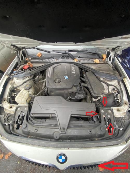 i was just now driving for maybe 6 miles and while i was parked with the engine running i noticed a little bit of smoke coming from front left end of the car. just out of front driver side kidney grill. at first i thought it was just an visual effect from heat of the engine (it is below 0 degrees C outside), but i went to check it and indeed it was smoke, cant say what color because it was dark outside and i had to use phone flashlight, but id say it was a thin white smoke (not the thick black kind of smoke when burning plastic). i shut the engine off and it gradually stoppedafter a couple of minutes i started the car and drove home (1 km drive) and when i stopped it was smoking again from the driver side kidney. popped the hood and noticed smell of burning. also there was some smoke coming from marked areas (empty space on the driver side between engine and radiators). i couldnt see any coolant leaks or clear source of the smoke, but im thinking it was maybe from front side of radiator because more smoke was coming from kidney than under the hood.checked the coolant level and it is just bellow the low mark, but the engine was hot and marking is for cool engine. engine sounds ok, heating works very good and i never had overheating light come on (bmw so no temp gauge on the instrument cluster)any ideas?