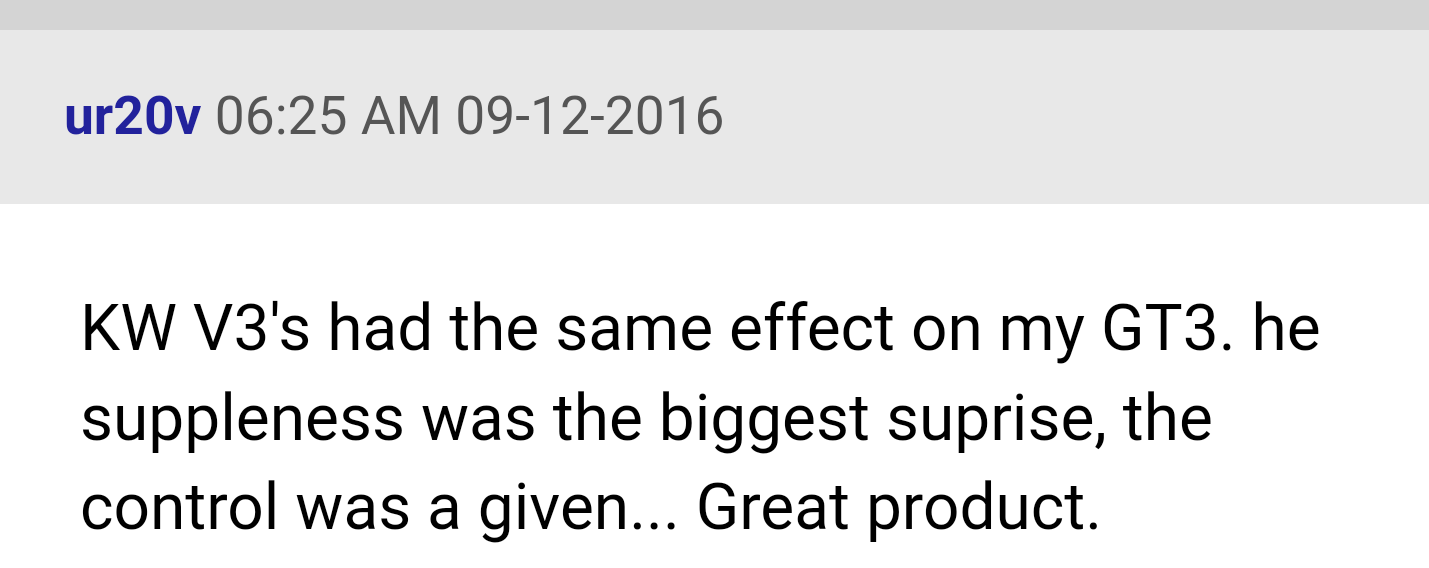 >>28744383The KW V3s aren't softer than stock THOUGH>>28744388No, I mean like the guy who replaced the beancounter-neutered bullshits which were too soft, to appease the old guys that actually buy them, with KW V3s which have more SUPPLENESS and CONTROL