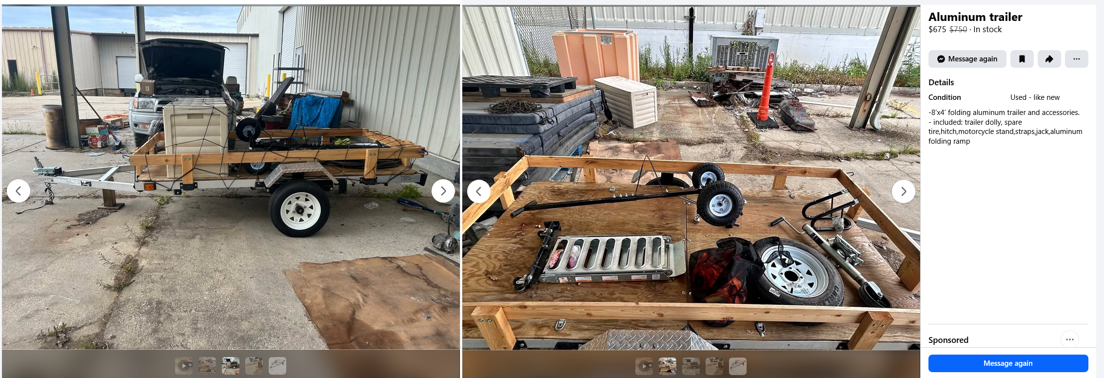 I've been looking at getting a folding trailer for moving bikes around. i offered 450$ for this and they said they'd do 500$. what do you think about that? this is the trailer i'm pretty sure:https://www.northerntool.com/products/ultra-tow-4ft-x-8ft-folding-aluminum-utility-trailer-kit-1170-lb-load-capacity-49803i've seen harbor freight ones like this going for maybe 350-500$, but those are also all steel, and this is aluminum so no rust. ramp looks like it's 70$dolly is 65$ at harbor freightwheel chock is maybe 30$extra wheel is maybe 60$ at the cheapesti'd at least need the wheel chock and ramp if i bought a bare trailer, which sort of knocks the price down to like 400$ since most other ones i see don't come with that.just wanting to get a vibe check from the boys before i pull the trigger on this. g2g for 500$?