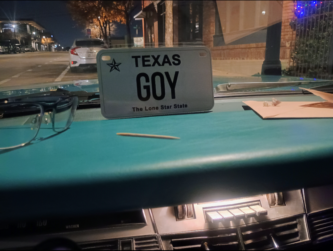 >>28773869Kek. It's a fake plate for prop purposes, but "GOY" is actually available in Texas for a motorcycle plate.