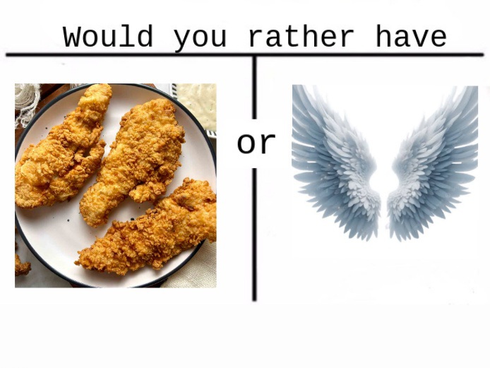 >>28785926Chicken strips or angel wings.