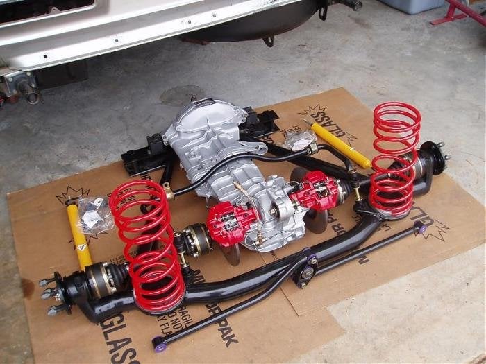 >>28799029>>28799038>packaging issue>re engineer the rear half the car to make roomWell yes and no. On a live axle car they have a bit of room to allow for the diff and tailshaft moving up and down so the room for a transaxle is mostly there. The flywheel and clutch are a problem you need to intrude into the rear seat area for those. As for the suspension it's probably not that bad. There are many options. Something like this probably wouldn't be too hard.