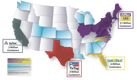 This picture doesn't accurately describe the clusterfuck that is central Florida, wherein there's not only Sunpass but the competing E-Pass because for some reason there are two different highway authorities. I think both are now interoperable with EZ-Pass, but unfortunately you're not getting anywhere far without taking a toll road or tripling your trip time.