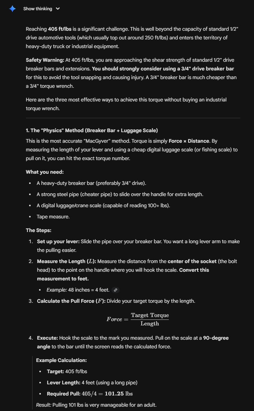 Replacing the rear shocks in my truck. Easy job, three bolts topside, one bolt on the bottom. But that bottom bolt gets torqued to 405 ft-lbs! My torque wrench goes up to 250. But I know how to math, so I figure I can use a torque multiplier to get the torque spec I need. But god DAMN those things are pricey. Hopefully, I only need to do this job once, and I don't want to buy a $500 tool to do it. What are the alternatives, or do cheaper multipliers exist?