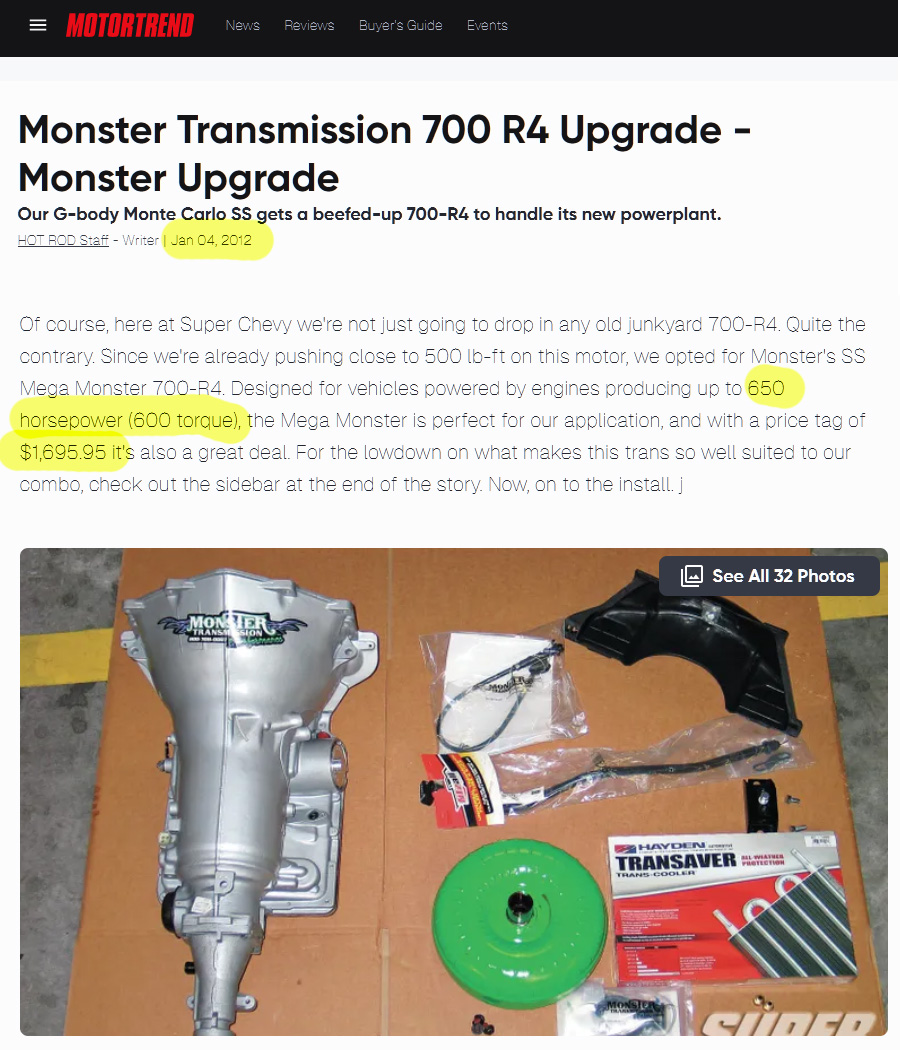 back in 2012 you could buy an entire setup to convert your 600hp car to a built 700R4 for $1700 bucks. that includes the transmission, torque converter, lockup kit, trans cooler, TV cable, etc. adjust that for inflation and that would come to about $2400 now in 2026.however this exact same kit from the same exact company now costs $4300. and i'm not just picking on monster, they're actually among the cheapest i can find. what the FUCK is going on.