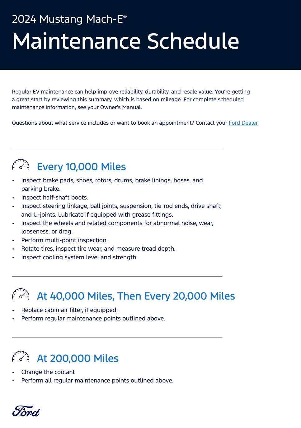 >>28871787So regarding the maintnence, this is the official schedule from ford; literally one page. The gearbox fluid is "lifetime" fluid. I will be replacing mine anyways but it's not part of the maintnence scheduleTires are still rated for 40,000 mile warranties even when "ev rated".Regarding the battery, this guy has put 300,000 miles on his mach e and his battery health is still at 92% of the original capacity. That battery will vastly outlive the car.https://www.forbes.com/sites/sashalekach/2026/02/28/hes-still-going-with-over-300000-miles-on-his-ford-mustang-mach-e/