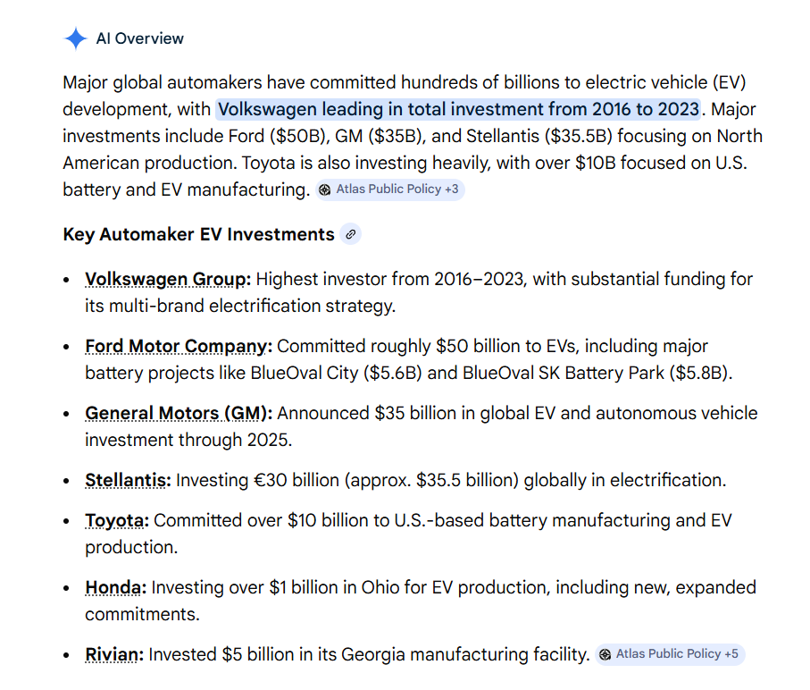 >>28874054>Major global automakers have committed hundreds of billions to electric vehicle (EV) development, with Volkswagen leading in total investment from 2016 to 2023Play stupid games win stupid prizes