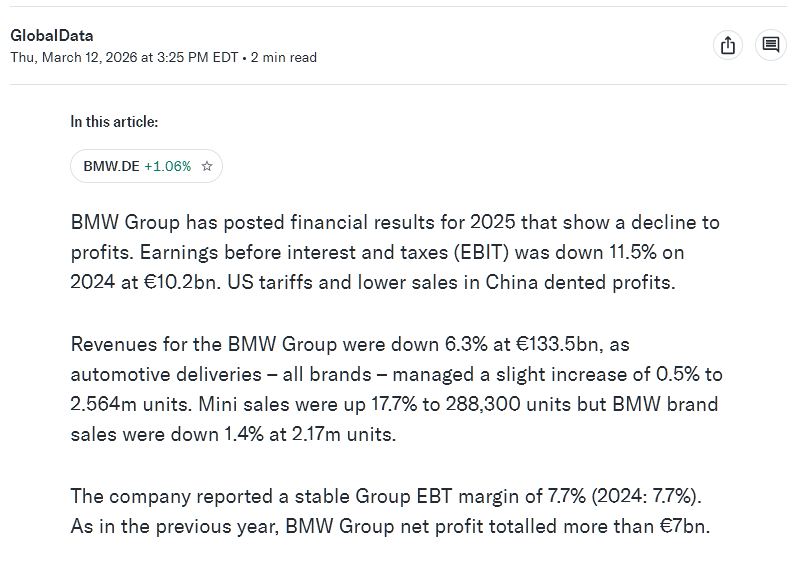 overall earnings are down 11.5% YoY.revenue is down 6.3% YoY.bmw brand sales figures are down 1.4% YoY.profit margin was stable YoY due to cutting $2.5B from operating costs, and mini brand sales increasing.