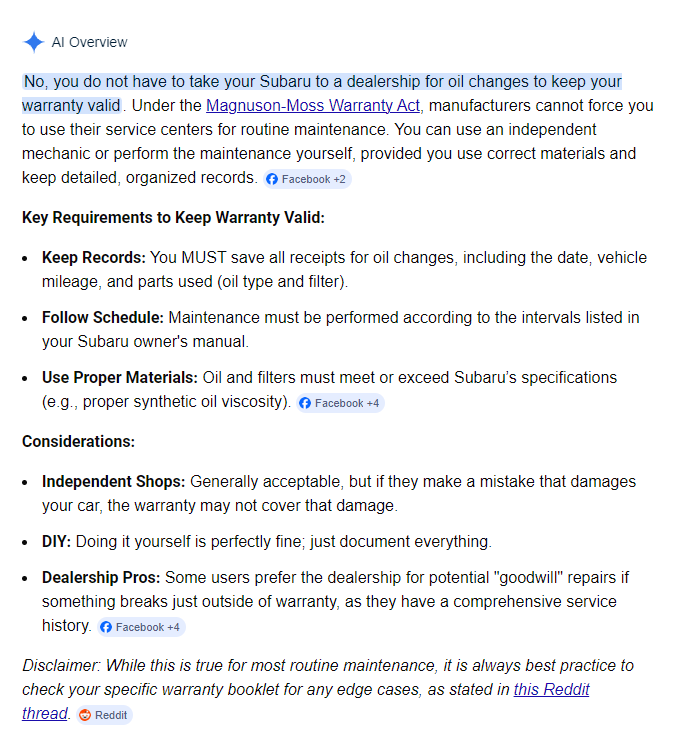 >>28884938>It is literally illegalThey don't care lol. There are hundreds of stories out there about Subaru denying claims, and all of them involved DIY maintenance, even when people had records. You don't get it. They will move mountains to find whatever petty little reason they can to deny you. Doing your own work makes it incredibly easy for them to do. https://www.impreza5.com/threads/rod-thrown-at-52k-dealer-denying-5year-60-000-mile-powertrain-warranty-never-missed-and-oil-change-and-take-care-of-my-car.16962/https://www.subaruxvforum.com/threads/denial-of-warranty-coverage-by-subaru-of-america.190825/