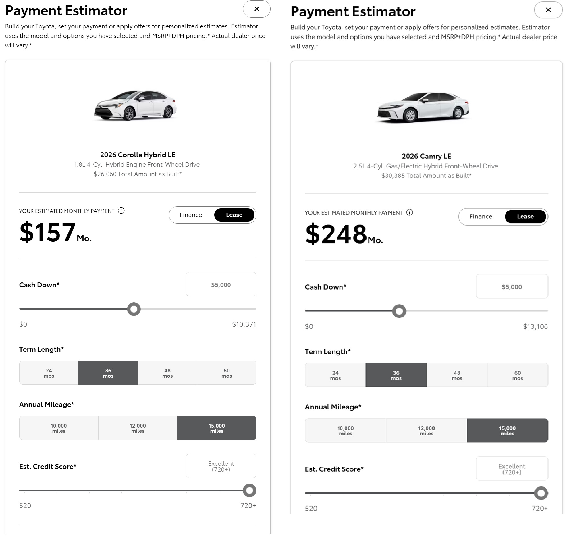 >>28885801Probably the corolla. Camry is just bigger, it's not any nicer nor is it better to drive, it's certainly not worth an extra $91/mo. It's actually worse to drive in my experience driving (non hybrid) corollas and camrys owned by my family.