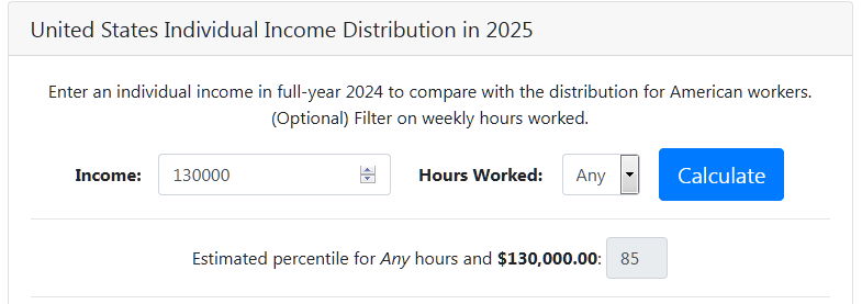 >>28897344130k puts you around 85th percentile, about as common as having a rather pedestrian 115 iq - 1 in 7. so every 7th person that OP drives by on the road makes more money than he does. pretty easy to explain what he's seeing.