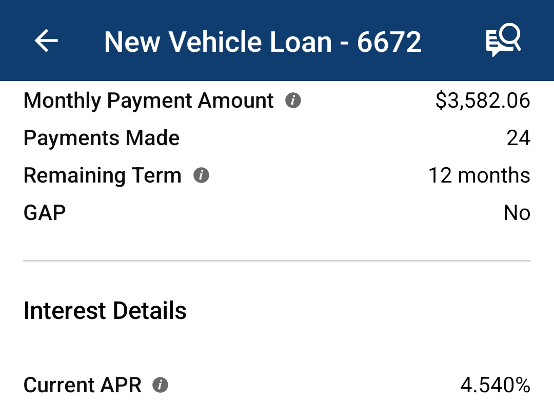 >>288975680% loans have the interest baked in the payments retards, don’t believe me calculate the loan total. Also insurance for new car is more and the FV of investments are better than a loan payment.