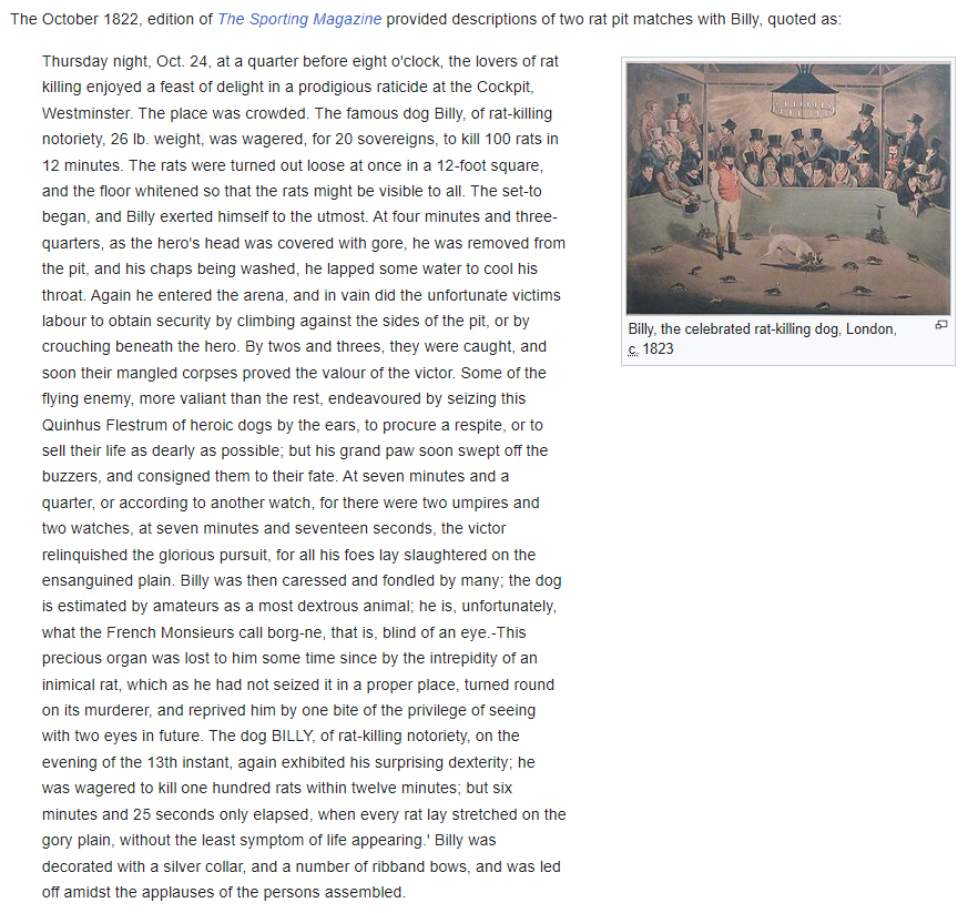 >>28906170Cats don't have anywhere near the level of prey drive of a breed like a rat terrier. A cat hunts when it feels like it, a ratting dog will go until it runs out of rats or is too tired to move. There are accounts of single dogs killing thousands of rats over the course of several hours. It was a whole sport, betting and record keeping and all.https://en.wikipedia.org/wiki/Rat-baiting