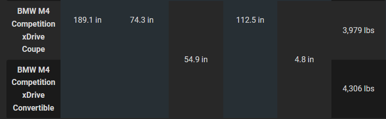 Square cube scaling law.Double the dimensions means 8x the volume.What this means for weight is>>28908213>vert vs not weight diff 320lbs>>28908285>vert vs not weight diff 70 lbsChecks out.Manufacs have always needed to significantly add structural chasis bracing to a vert. At a bare minimum it's for the torsion and flex to be similar so the fuckin car behaves like its supposed to, at the other end it's also needed for the crash ratings to be similar.