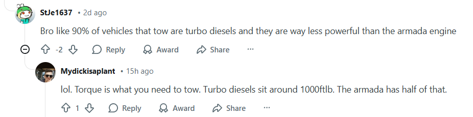 >>28914284He's not saying you "need 1000lbft to tow" he's saying that using hp as a metric to evaluate towing is wrong and torque is the important thing to focus on. First guy is trying to imply the Armada is more capable for towing because it makes more power than a turbo diesel. Second guy corrected him by saying torque is the number to look at, where turbo diesels have 1000lbft which is far more than the Nissan, therefore making their engines far more suited for towing