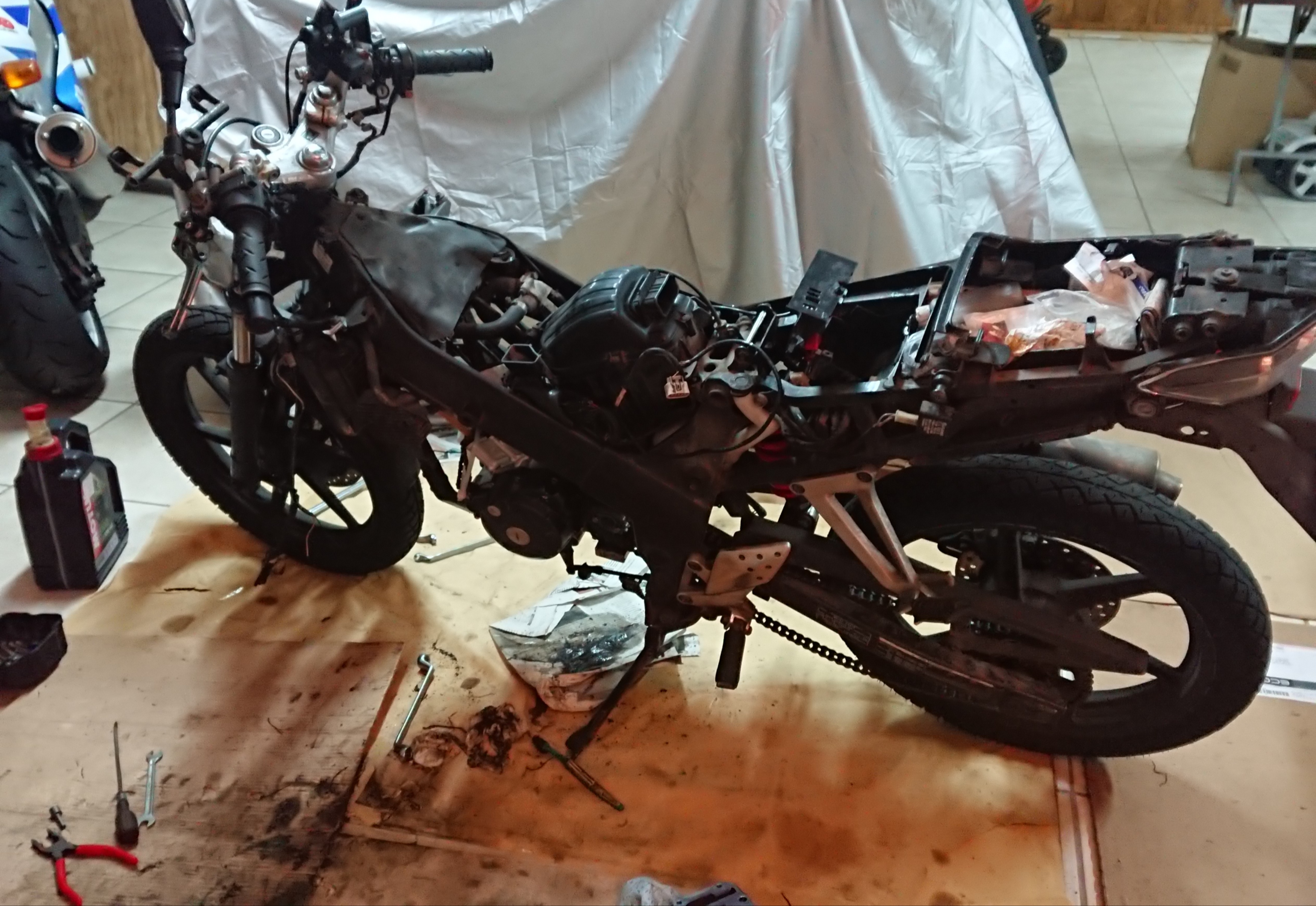Need to get to thermostat for replacement:>damper off>tank off>airbox offnext is throttle bodies off>get airbox off and look in between ram air ducts and see big pile o fluff>mouse nestremove airbox and clean away nest>chewed wireswelp I now know why I would have random bike die / ignition cutFUCK MICE.