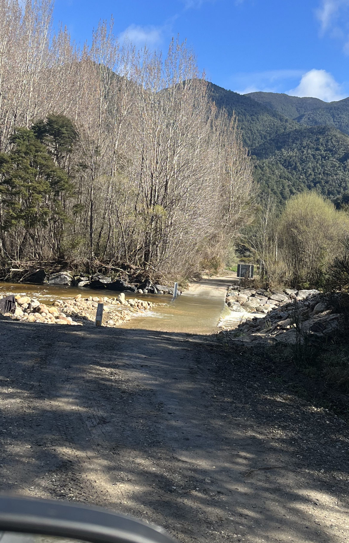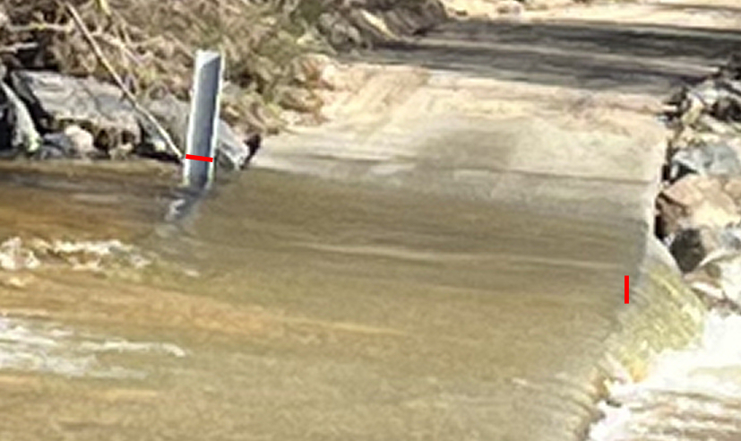 These markers are 4 to 6 inches wide. The water at that crossing is maybe 3 inches deep. A 2wd with bald highway tires would be fine. Maybe if you had a stanced/slammed shitbox that scrapes on driveways you would have some clearance problems but you could drive a ride on mower through that.