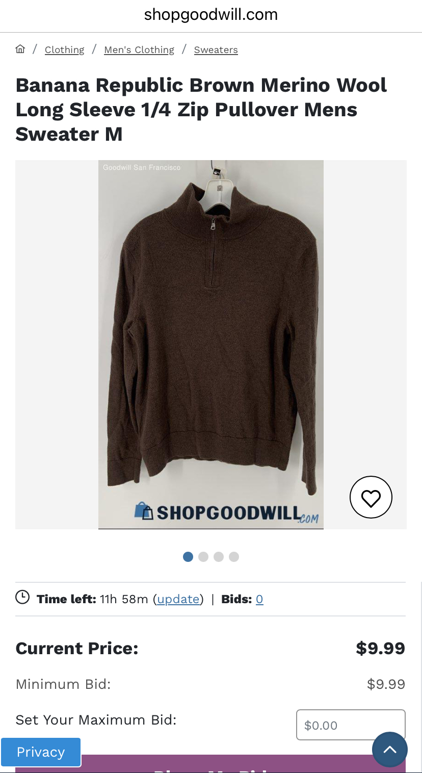 I’ve found a few things at shopgoodwill. It’s kind of a roll of the dice because you don’t know the condition or if it’s been run through the dryer too many times. Usually you’ll find things like pic related. Not exactly marketed to the outdoors, so there’s no information on garment weight, but it’s 100% merino wool. Size M, so if you bid keep that in mind. Those sweaters are around $100 new, so maybe 80% off after shipping. Ngl they work great for casual wear as well, if they’re not beat to hell already. Outdoor name brands usually sell for a lot more. There’s a 250g 1/4 zip Smartwool sweater in a bidding war right now for $46. Still a good price, plus you know what you’re getting. But it may reach a price where it’s not worth the gamble or not worth buying used.