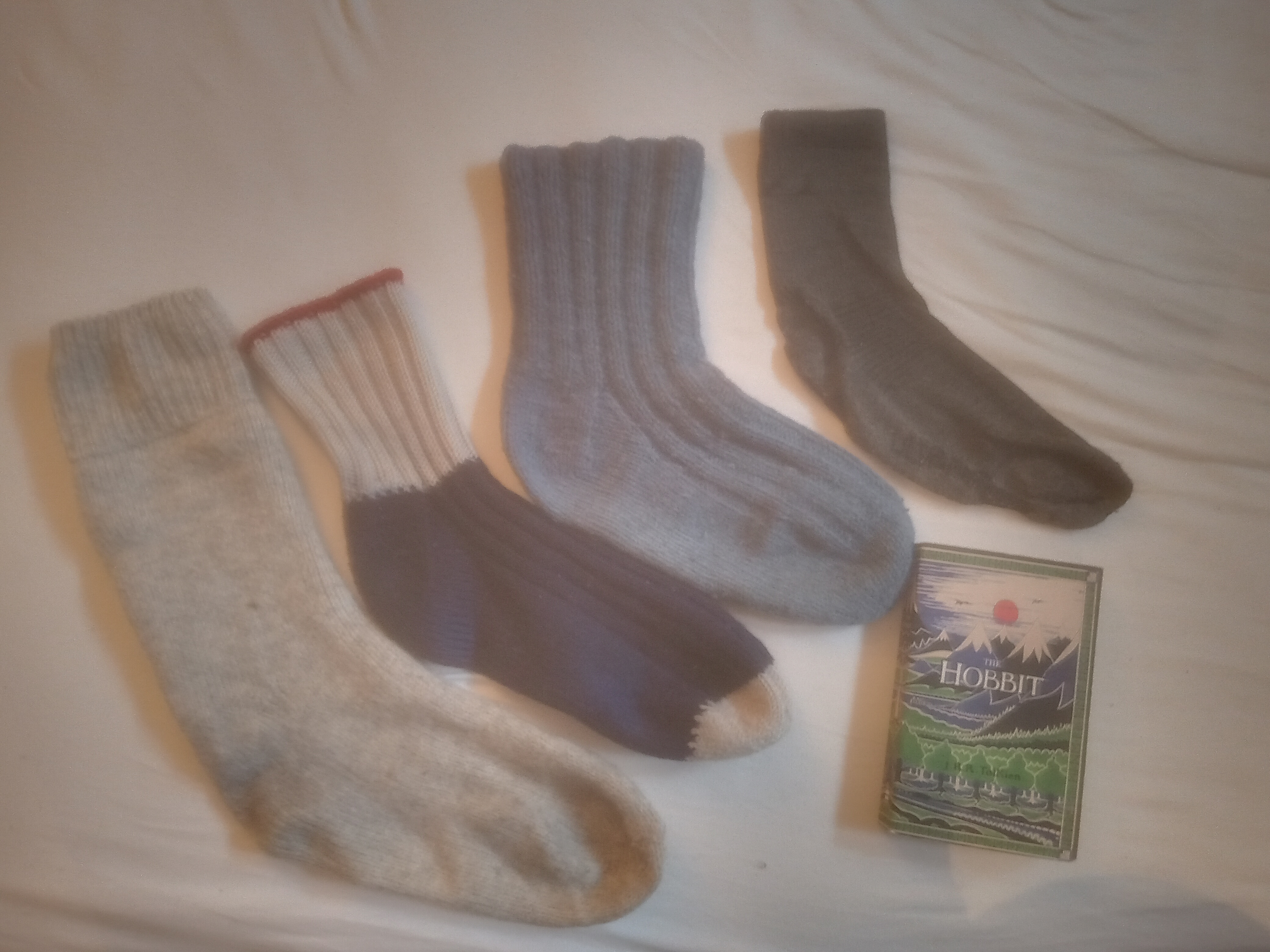 >>2845417Do excuse the bad quality photo, my phone camera sucks. Also I am out visiting my brother and his family ATM.The 2 in the middle is 100% wool, the one with white and red is my sister's handy work and the blue one is from a grand aunt, they are a bit too nice for proper outing then I use the big one witch is this one. https://www.felleskjopet.no/hjem-og-fritid/fritidsklaer-og-sko/stroemper-og-sokker/raggsokker-graa-50342935-base/The smal one I usually wear at any time also summer, it is a bit worn tho. I always wear 2 pairs when hiking to never get chafing. They are some kind of Ulvang-socks can't remember. Thay are like 60% wool. The big gray is 80% wool and every farmer, woodsman or outdoor labourer whort his salt have many off these ones.>>2845470This. It also depends a lot on the wool and knitting for how durable they are.