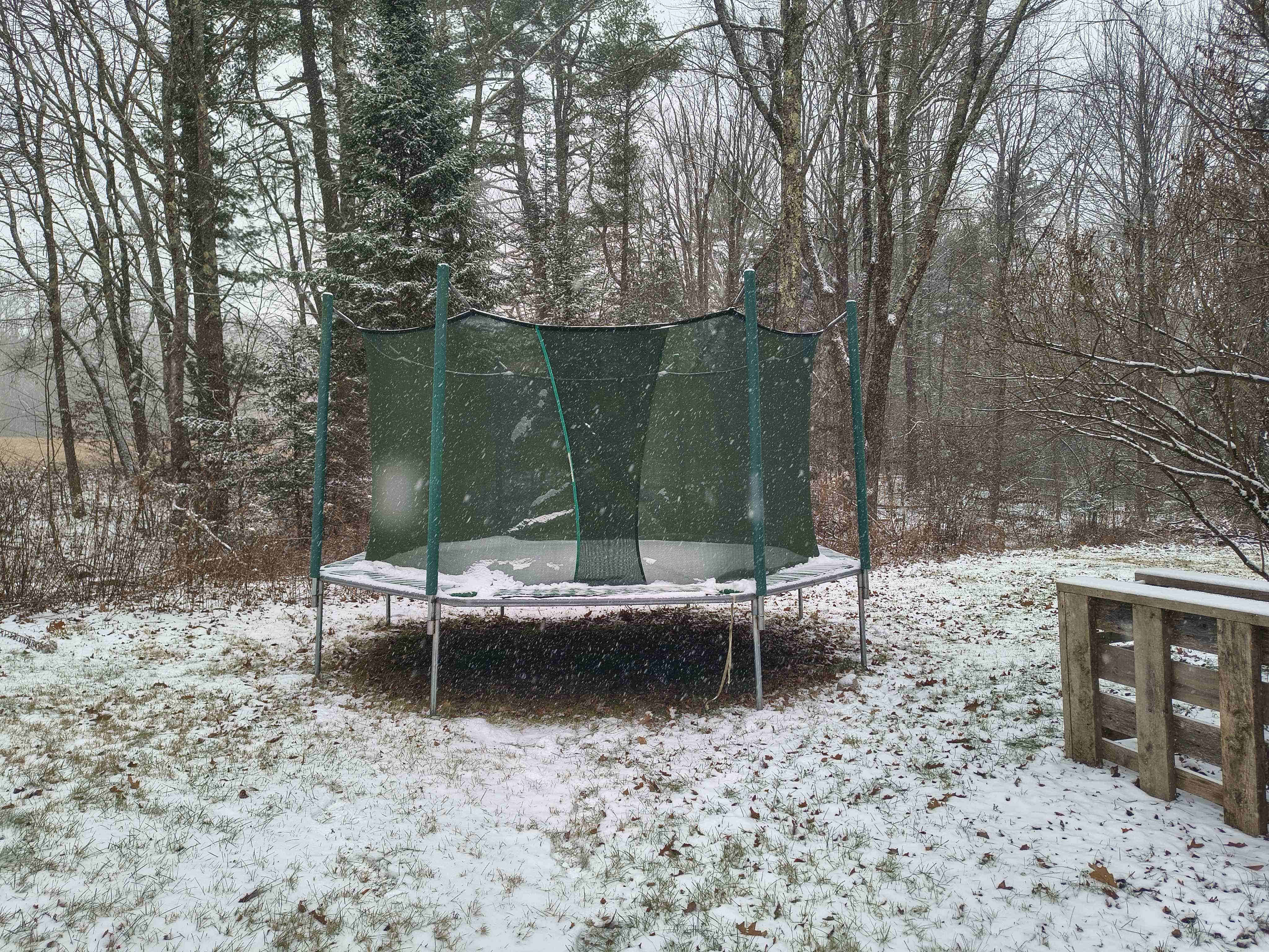 >My parents are pretty lenient with me when it comes to chores.>Wash my own dishes, put my cloths in the washing machine and that’s about it.>They even fold them for me.>An apology for being too rough with me as a kid I think.>But there is still one chore I do anally, and even if they offered too do it for me I’d still do it myself.>Every year on the first snowfall my trampoline must be taken down. The constant weight of the snow will cause it to stretch and warp otherwise.>If I don’t the cloth will stretch causing it to loose tension and you’ll have to work harder to jump and it won’t be nearly as satisfying to use. A while of that and you need to buy a new net and springs, years of neglect the frame will buckle and you just have to get a whole new trampoline at that point.>When I was a kid my trampoline was my safe space, if my parents were being hard on me or school was stressing me out I’d just climb on in and get lost in my imagination. The weight on my shoulders disappearing in the momentary weightlessness of zero g.>I’d imagine fantasy worlds with wacky characters and if I was angry I’d imagine those characters tearing people apart until the anger brought me to tears or mental exhaustion.>My therapists at the time told my parents that they shouldn’t bother me or attempt to “correct my behavior” while I use it and that its healthy for kids to have a private safe space. To their credit they didn’t.> I’m in my early 20’s now and I’ve never grown out of the thing, it is still my safe space, a place for me to unwind, and now that I think about it my sole source of exercise.>Today is the first snow of winter.
