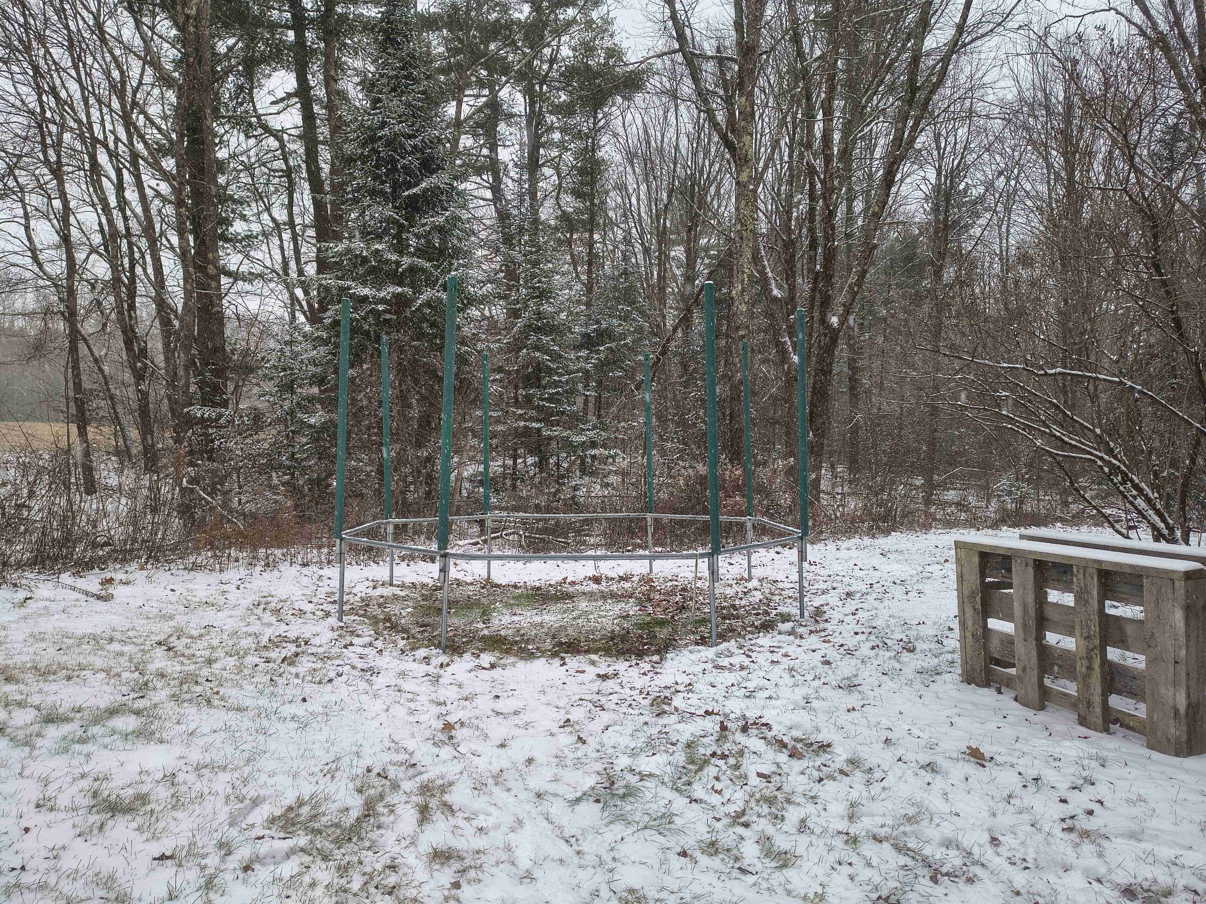 >I imagine this is how a farmer feels when they have to put down their favorite milk cow, something you’ve taken care of for a long time and has taken care of you for a long time. But the only thing you can do to help it now is one last betrayal. Ultimately replaceable.>I shovel the snow off it and use it one last time but just shy of satisfaction so I don’t tire myself out before the task to come.>Since my trampoline is my only source of exercise my legs are surprisingly muscular but my upper body strength is lacking. I slide the protective mat out of the way exposing the cold metal springs and begin the arduous process of yanking on them one by one, there’s around a hundred of them and it’s an exhausting process. It’s dangerous too, and I’ve cut the shit out of my hands doing it in the past. Whatever machine pinches off the metal wire when manufacturing them sometimes leaves a little tag that gets stuck on the frame of the trampoline when you try to remove it. Sometimes my weak grip or a false sense of security will get the better of you before the tension suddenly releases taking a big chunk of your skin with it, or in this case my glove. One time it almost got my wrist.>Once the last spring from the base is out and thrown into the bucket, I hoist myself up to reach the ones holding up the net being careful not to slip on the icy frame. Then when that’s done, I drag the massive, and spitting definition of cumbersome, net into the basement where I just have to hope mice don’t eat it for the next 4 months.
