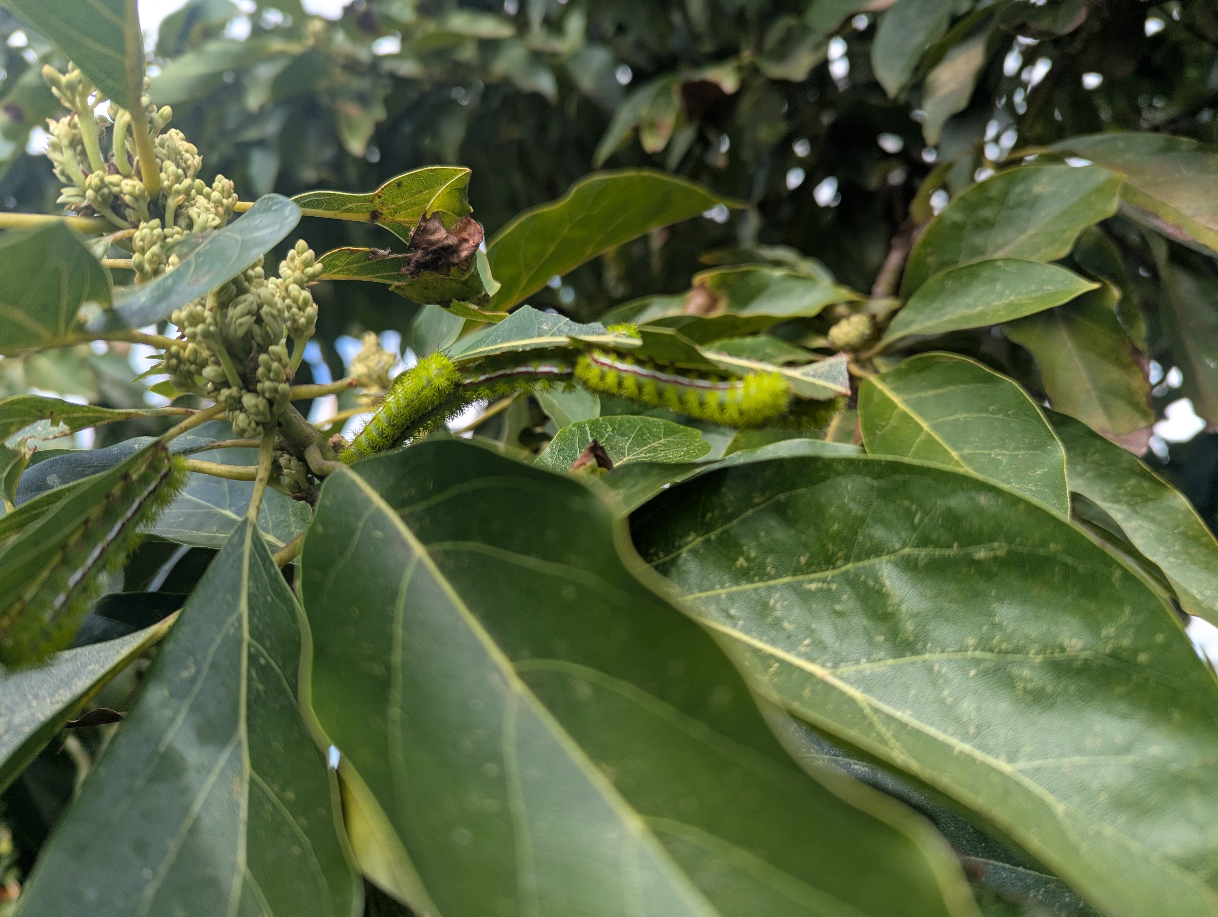 Io moth caterpillars on my avocado tree. Their sting is pretty painful. Should I get rid of them? They don't seem to be eating the leaves too quickly.