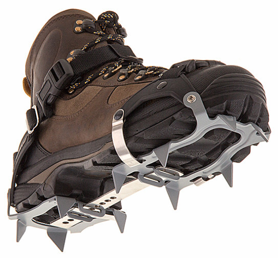 >Microspikes are the way to go on icy/packed hiking trails with easy-to-moderate slopes