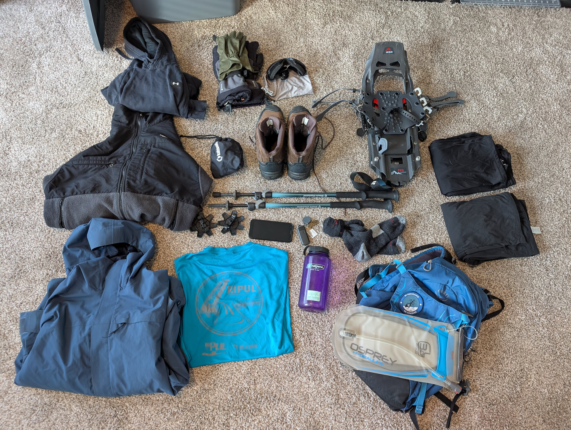 >an insulated water bottle or some to keep your hydration tube warm because that thing will freeze shut and you have to stuff it down your back or somewhere else to thaw out.