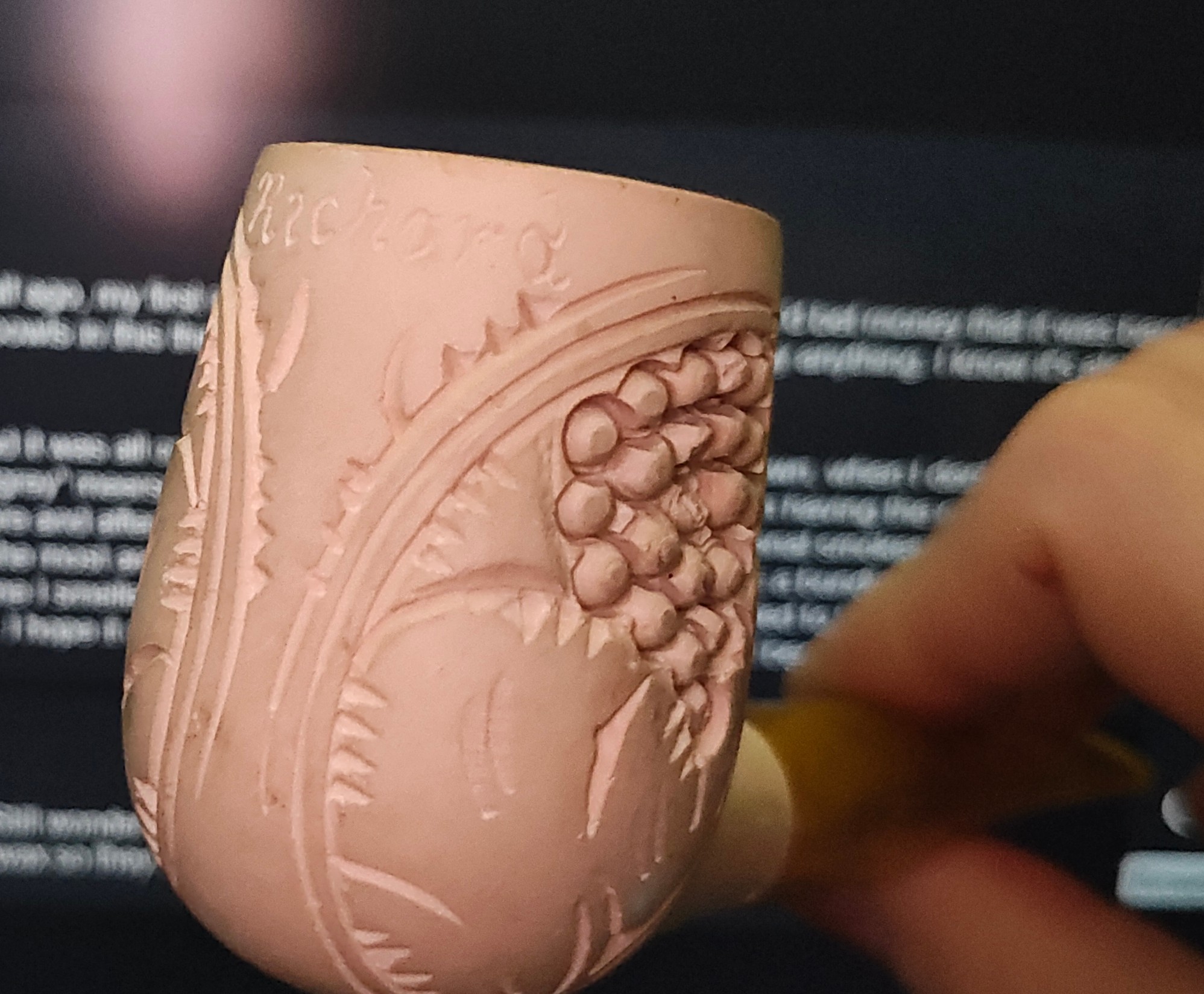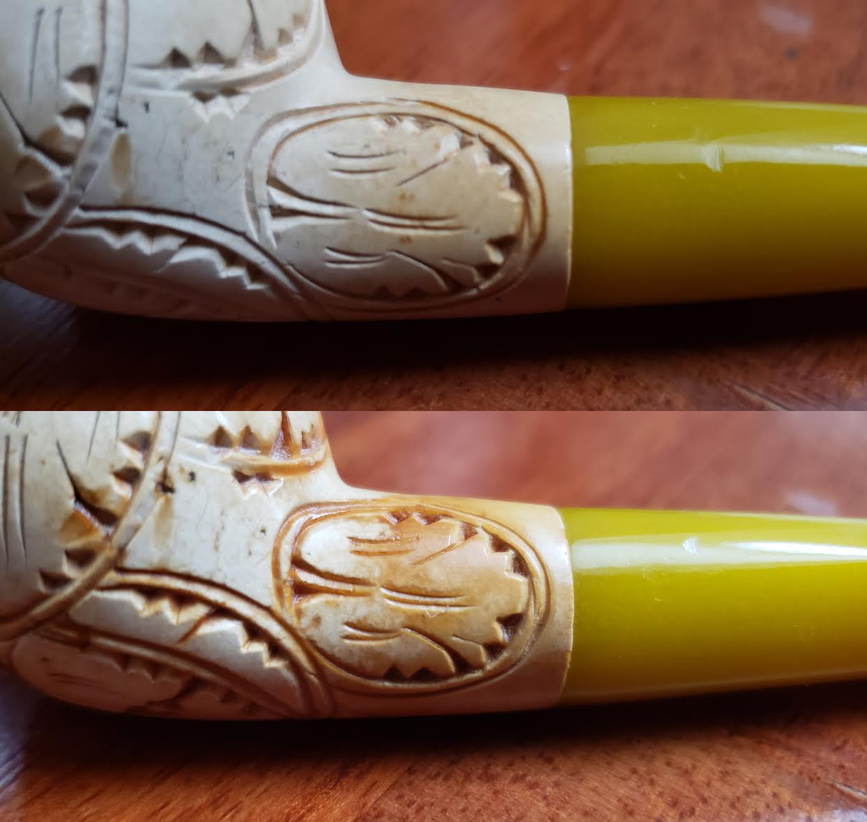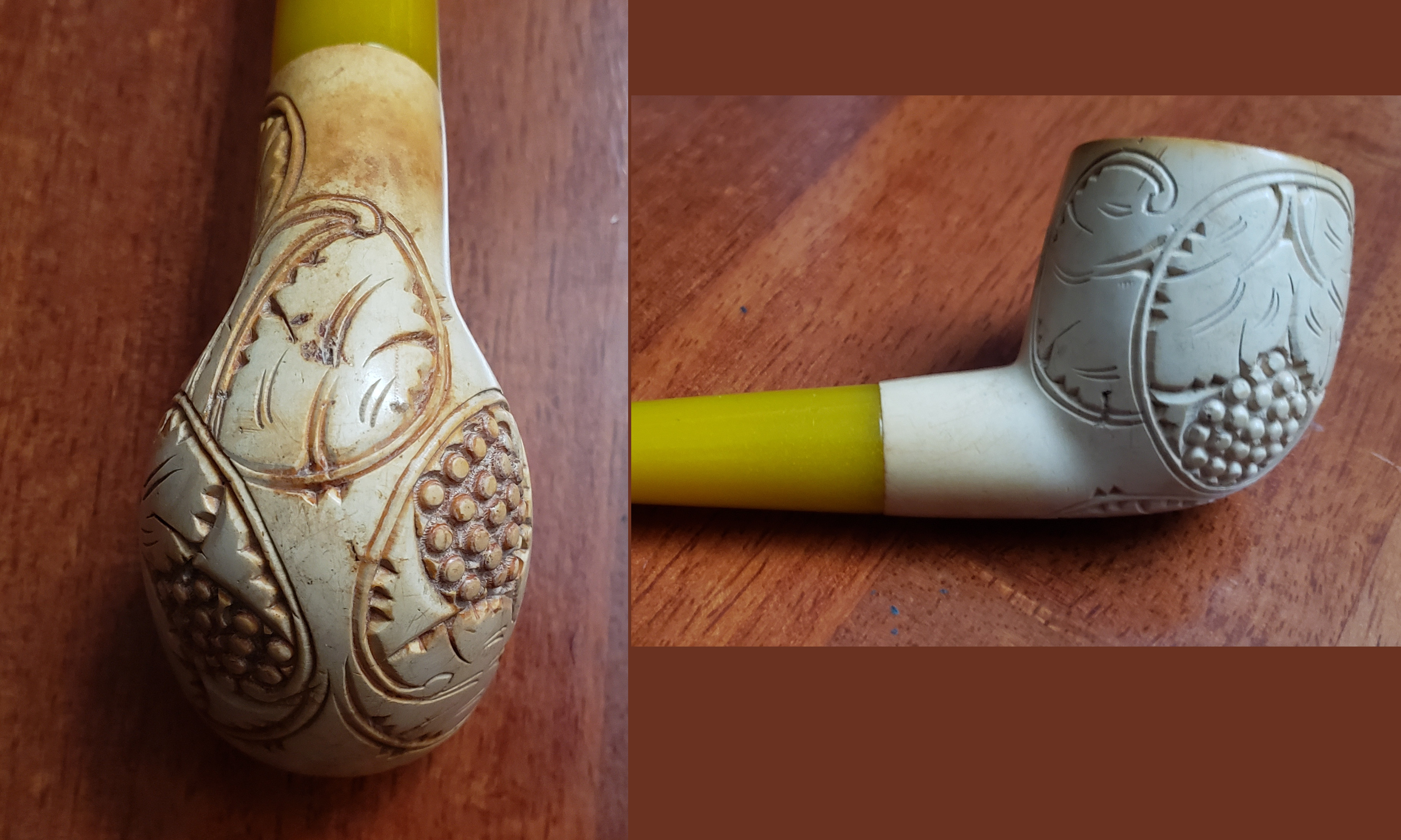 >blogpost: Got an estate meerschaum about a year and a half ago, my first meerschaum. No idea how old it is, but I'd bet money that it was barely smoked when I got it. It became my favorite pipe to smoke because it just smokes so nicely, and I've smoked probably 700 or more bowls in this thing, but it just wasn't coloring at all. Barely anything. I know it's almost definitely low quality meerschaum, but it made me sad how much I like smoking this thing and how much it wasn't coloring. So I looked around how to color meerschaums and it was all crazy things like smoke aromatics upside down, when I don't even like smoking aromatics much and definitely not out of a meerschaum. Then I came across a forum post where a guy described buying an old "grey" meerschaum and waxing it with beeswax and then having the colors come out without him even needing to smoke it, so I ordered some beeswax, waxed it, and my god the difference is enormous. This is just a before and after of wax being applied to the pipe, not additional smokes between. All of the designs on the pipe really pop now. The meerschaum itself is still not as dark as I would have hoped, but it's nice that the part that seems to have taken the most are the grooves of the carved designs. There is a bundle of grapes on this pipe that looked pale as bone and now it's completely brown. And man, I had no idea beeswax smelled so good. It's intoxicating. I can't remember the last time I smelled something that I got "addicted" to and needed to keep smelling, but beeswax smells incredible. Like a warm bouquet of honey and flowers. And I just smoked a bowl from this, and there is a pleasant aftertaste of that smell in here. I hope it eventually goes away, and I do think that it will because it's still freshly waxed, but I am even enjoying the beeswax aftertaste for right now.