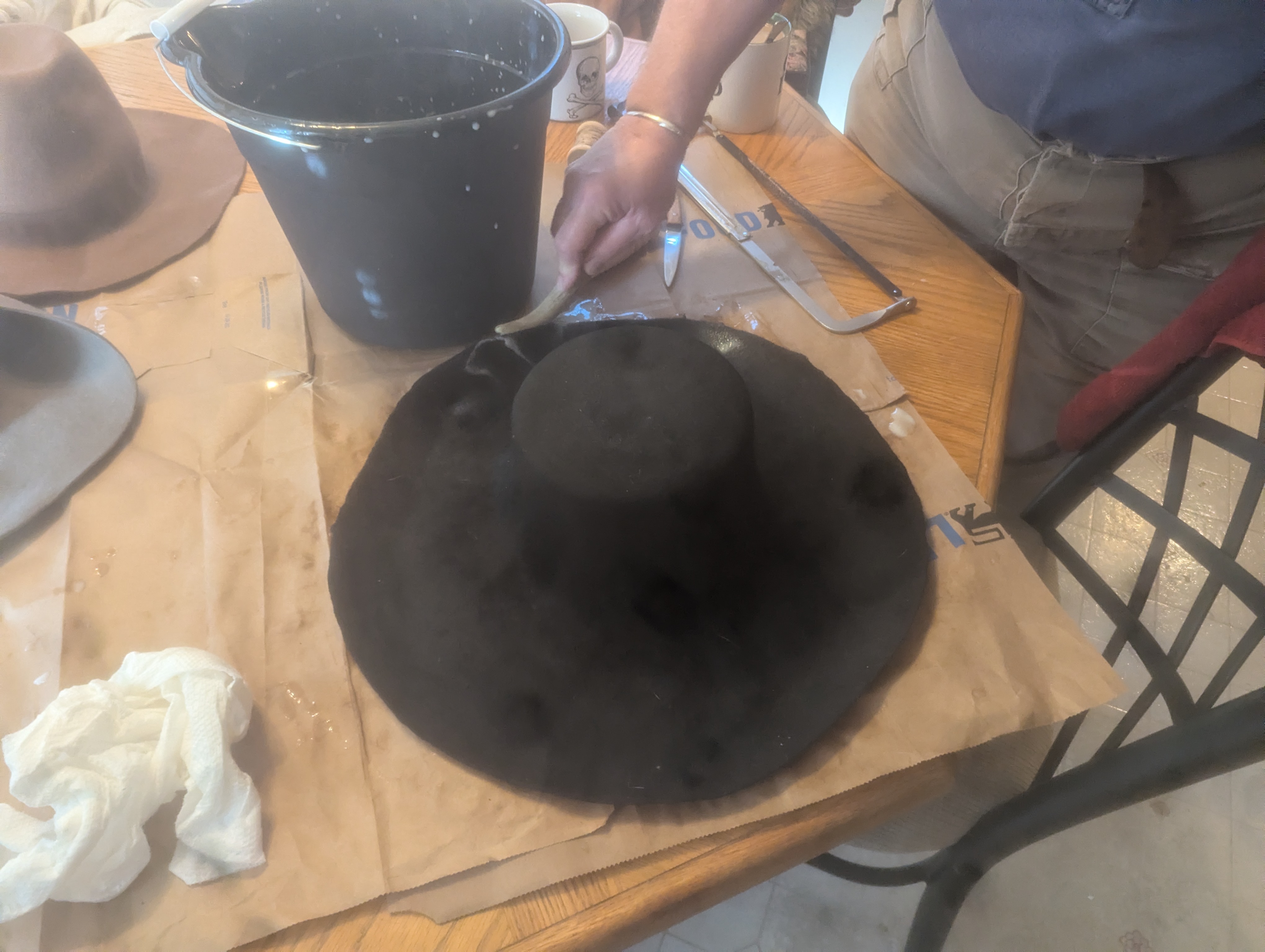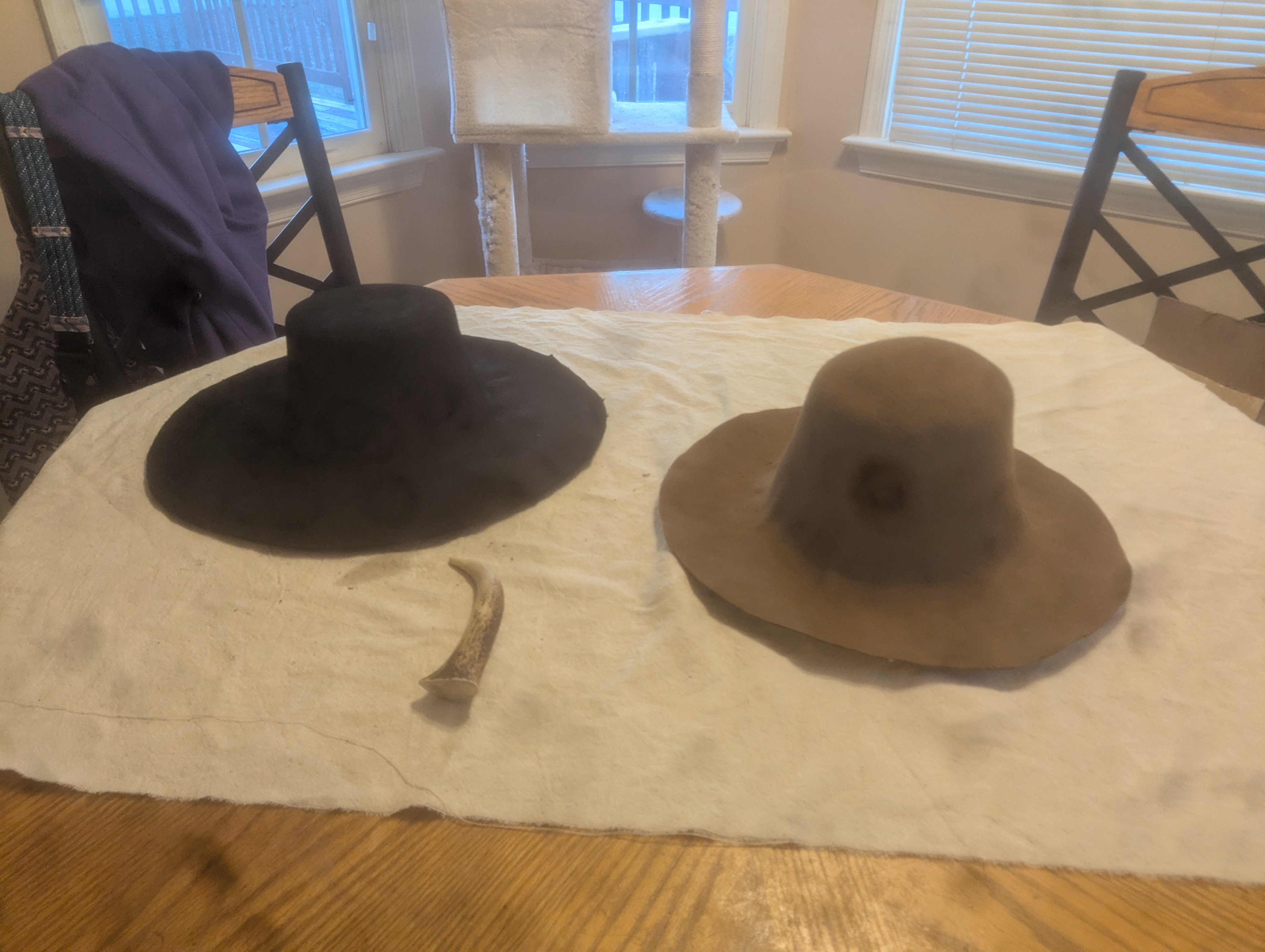 To fill the three image start, working on blocking a lot of new hats for folks in our 17th century group, for our hopeful spring excursion.