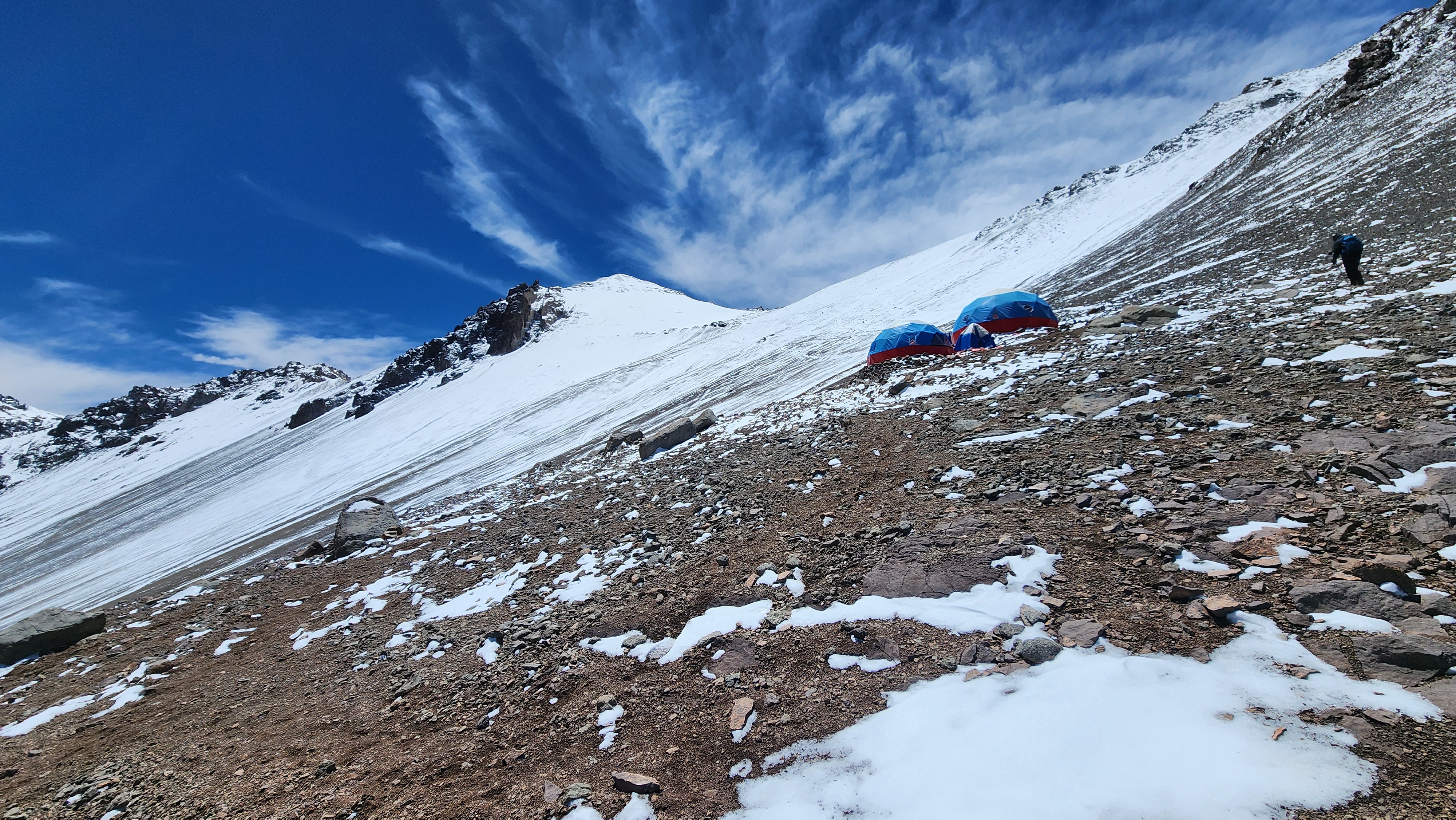 >>2859984Day 5 update. Things got dicey weather wise since yesterday, which closed the weather window I had planned (mostly to port stuff to higher camps) and added like +30km of wind every day so I'm not feeling confident about summiting.That being said, I went close to Nido de condores today to acclimate better, I made it to 5400 and had ½ or maybe an hour to Nido de condores but I headed back so I didn't get caught by any weird snowstorms in the afternoon.I'm acclimating to prepare for the possibility of having to bring my stuff to Nido the day before and just push from there if a short weather window occurs. So I'll be climbing back and forth weather permitting to the higher camps to get in shape.I'm not going to port stuff because if the weather gets worse I would have to go get my stuff and that would suck too much.Pic is from from Espina de Pescado, a few hundred meters from Nido de condores.