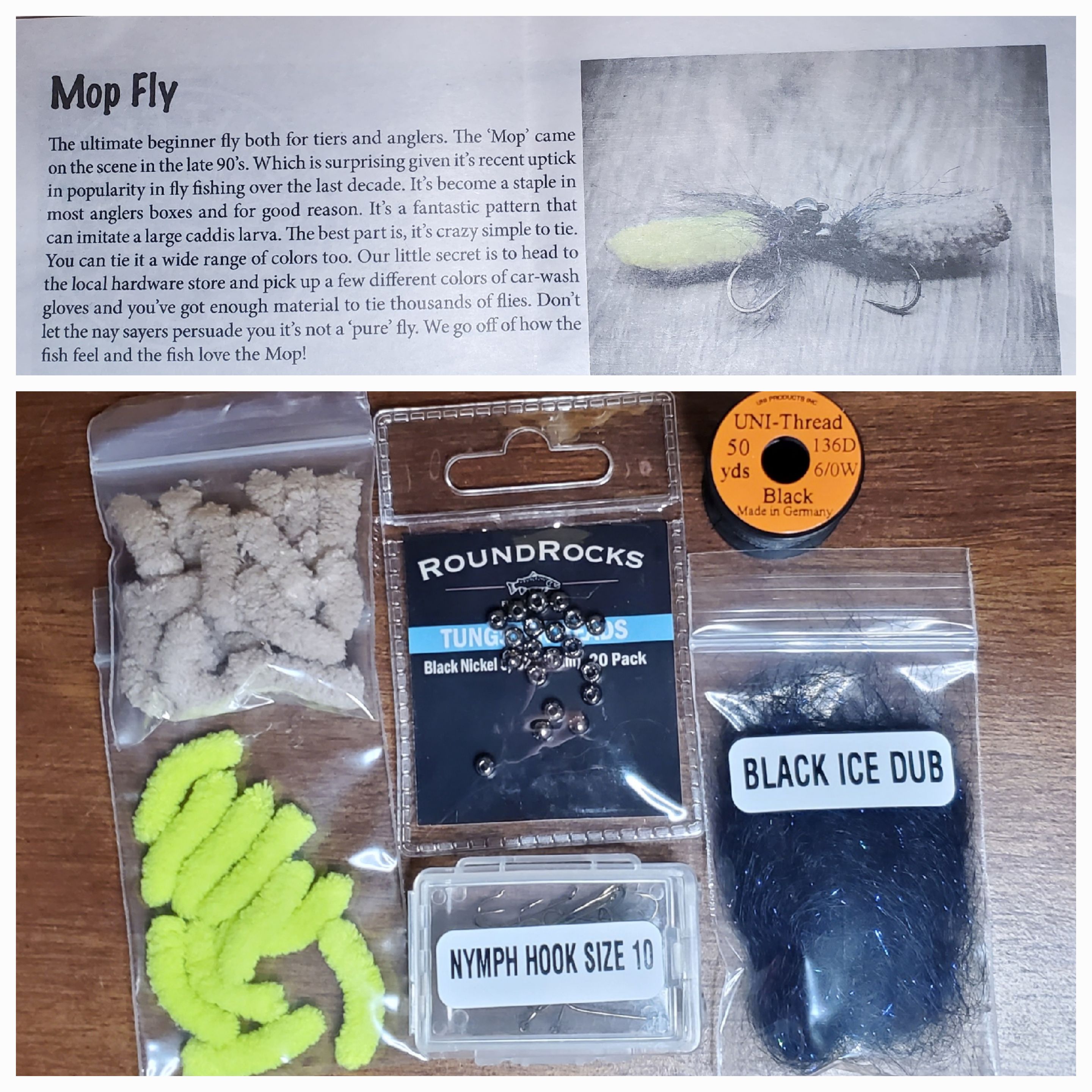 I got my monthly Smitty's box in the mail last week. But I've been in a bit of pain, so I just got around to opening it and tying the patterns. This month's beginner pattern is a mop fly. This is a super simple pattern. You're just tying in the mop and a dubbed thorax. Included materials: size 10 nymph hooks, 4mm tungsten beads, 6/0 uni thread in black, brown and chartreuse mop and black ice dubbing.