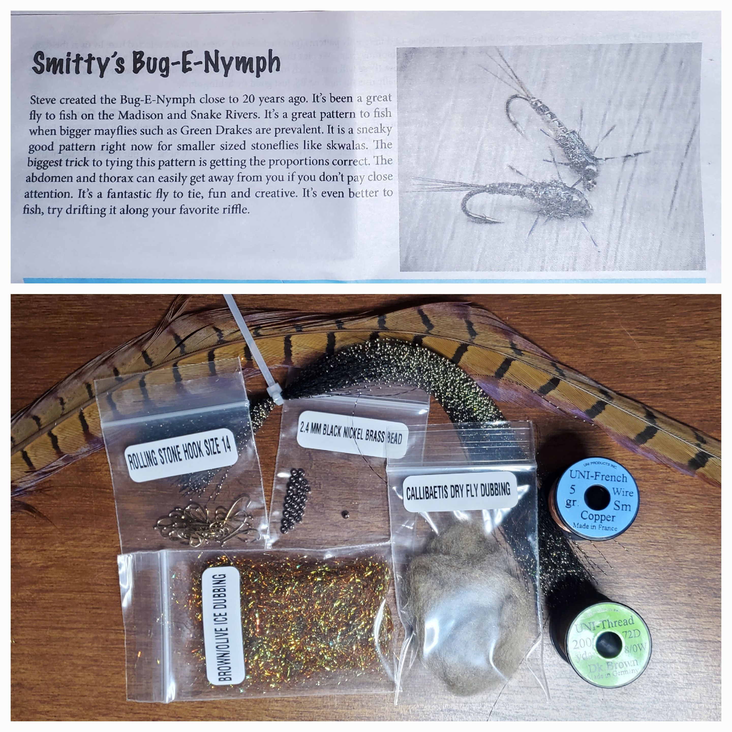 >>2861431The intermediate pattern the Smitty's Bug-e-nymph. It's a fairly simple pattern. A hare's ear with a full body wing case and legs. Materials included: size 14 rolling stone hooks, 2.4mm brass beads, 8/0 uni thread in brown, small copper wire, black crystal flash, a pheasant tail, callibaetis dry fly dubbing and brown/olive ice dubbing