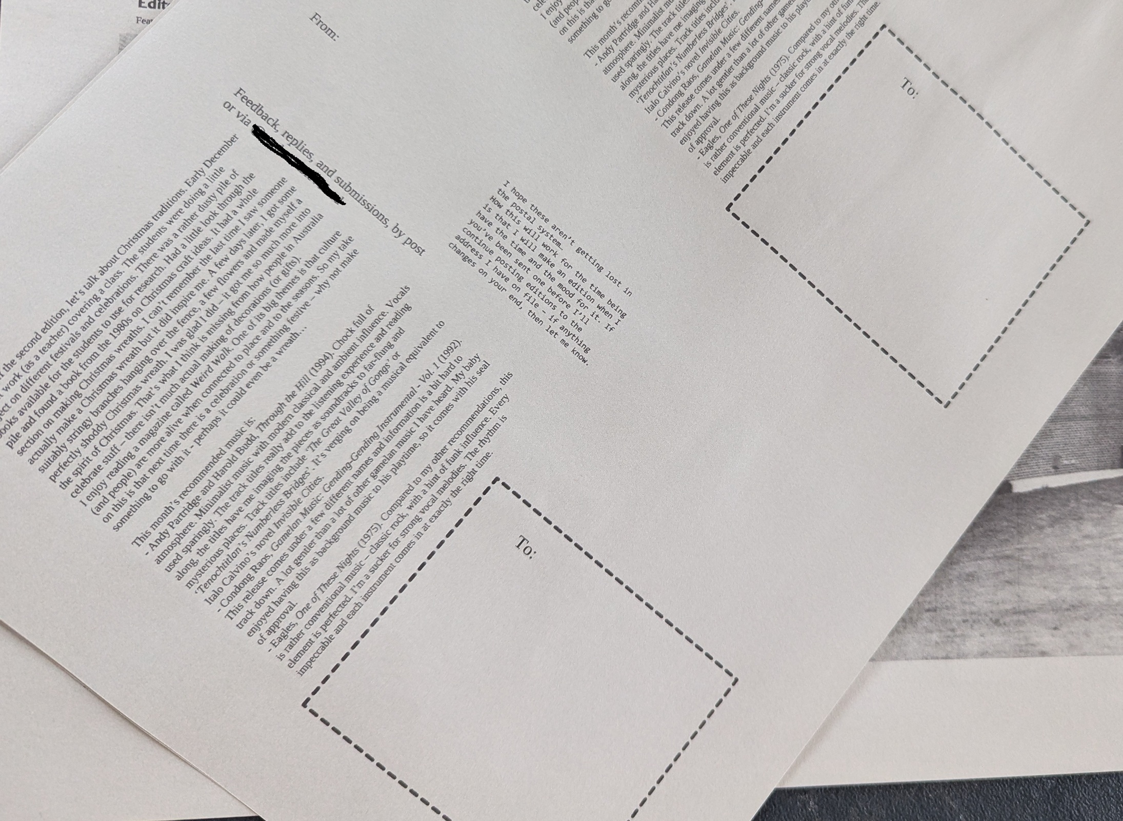 Pretty inspiring. I have a photo project in mind relating to my local city. Maybe I should learn some InDesign or whatever you use for this and blow 50 bucks on printing a couple of these and distributing them at random places.How do you guys distribute? Just give them to random people? Leave them lying around in second hand stores?I was thinking of maybe looking out for artsy looking people at local cafes and flea markets and just harassing them with a zine.