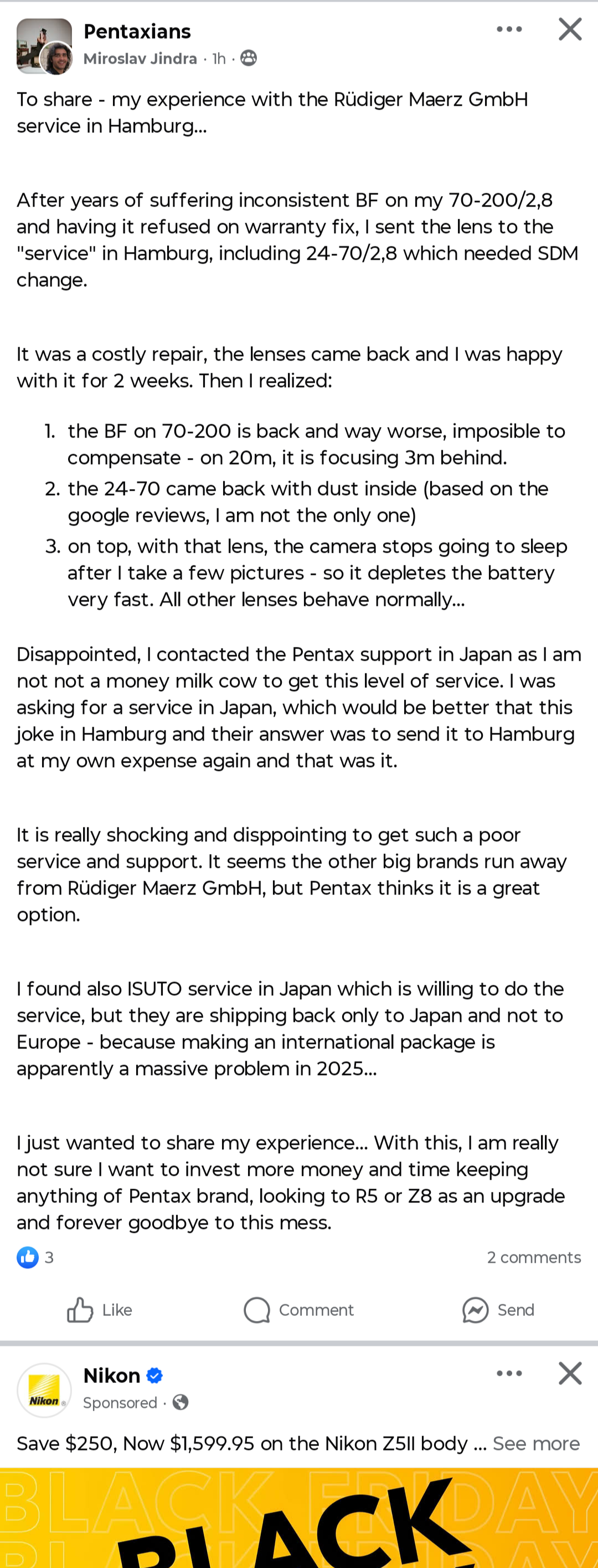 shit tier autofocusRAW buffer the size of Gnat Bladderscrew drive lenses in 2025jpeg profiles locked behind new lenses with HD coatings nullifying their whole selling point of old K mount lenses still work on their modern camerasdid I mention shit tier autofocus?mirror slapping shake during burst mode produces blurry images so they gimped the RAW buffer to reduce the mirror slapbaked in noise reduction in RAW filesaperture block failure over a 10 year period in like 4 different models of cameras. judge doesn't allow a class action lawsuit. pantecks refuses to fix defective cameras out of warranty.pentax k-3iii released in 2020 monochrome version in 2024. put a usb-c in the k70 and called it a KF. nothing else.Nikon Z6 in 2019 nikon now has z6, z6ii, z6ii, z7, z7ii, z8, z9, zf, zfc, z50, z50II, z5, z5ii, and z30 camerask mount lens roadmap is killk mount lenses are kill3rd party support is killk mount is kill