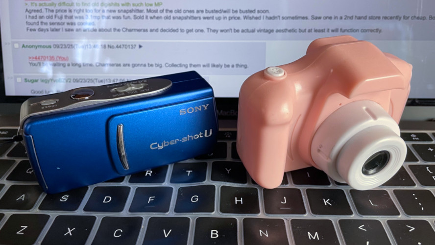 >>4470131>. It's actually difficult to find old digishits with such low MPAgreed. The price is right too for a new snapshitter. Most of the old ones are busted/will be busted soon.I had an old Fuji that was 3.1mp that was fun. Sold it when old snapshitters went up in price. Wished I hadn't sometimes. Saw one in a 2nd hand store recently for cheap. Bought it and found the sensor was cooked.Few days later I saw an article about the Charmeras and decided to get one. They won't be actual vintage aesthetic but at least it will function correctly.