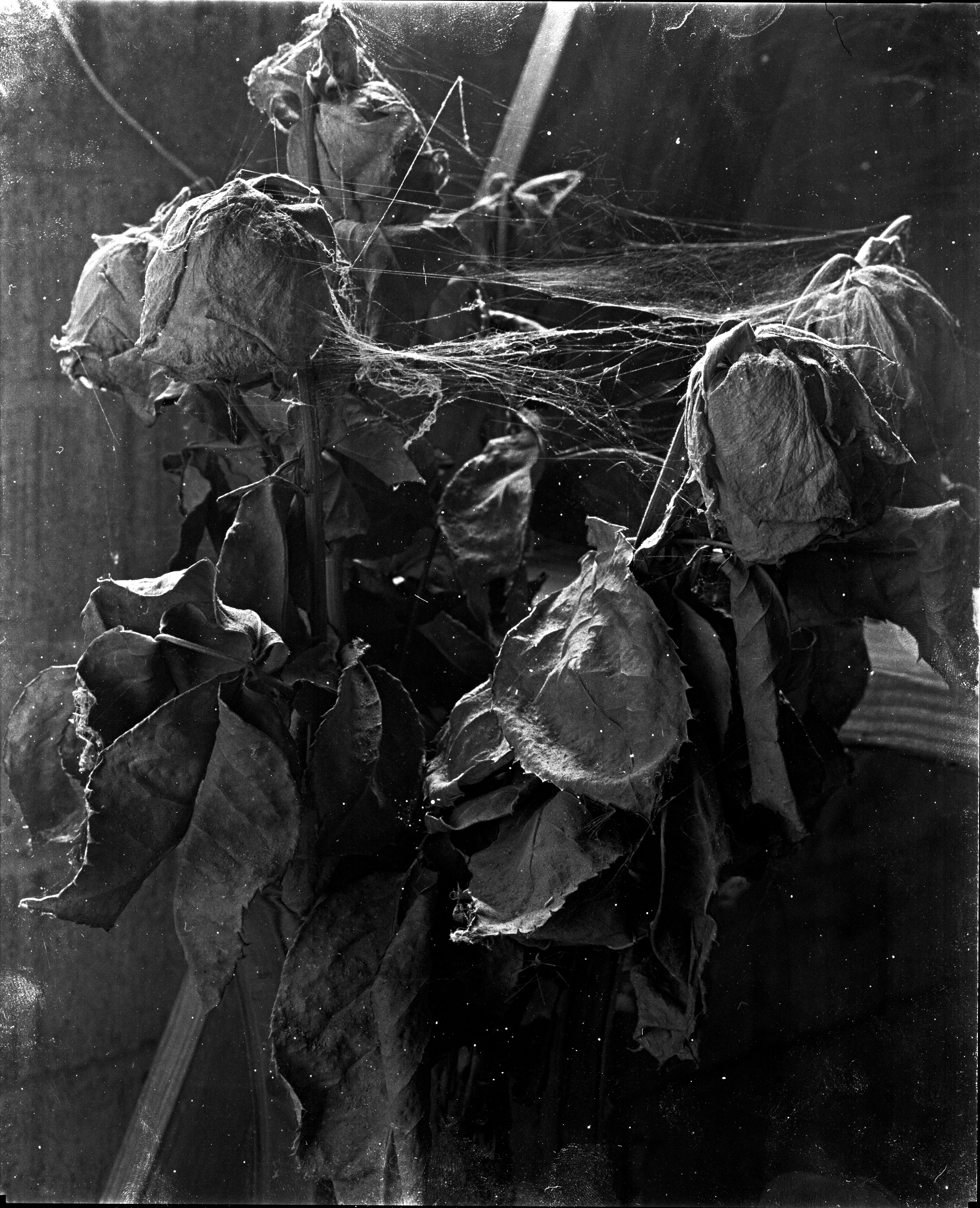 I wanted long exposures without resorting to f240, so I asked chatgpt to make me a developer that reduced the speed of film a lot. Came up with a phenidone based developer. It said it would make fp4+ drop down to about 12 iso. Metered @ 12 iso I got a 17.5 min exposure @ f64, and I got a negative so thin you can only see it in the right lighting. Scanned "fine", but contact printing times would likely be far too short to make a print from it. Doing my next test exposure for 3.5 hours. Same scene, but the light will gradually fade from the window I'm using to photograph the image, so part of that time is to compensate for that. It metered at like 16 minutes, but I gave it an extra stop just for fun. 30 mins = 3.5 hour exposure with reciprocity.Should be interesting to see if I can get the extra density I want from the negative.Sorry about the dust and shit. This is strictly a test shot. I think I figured out where it's coming.