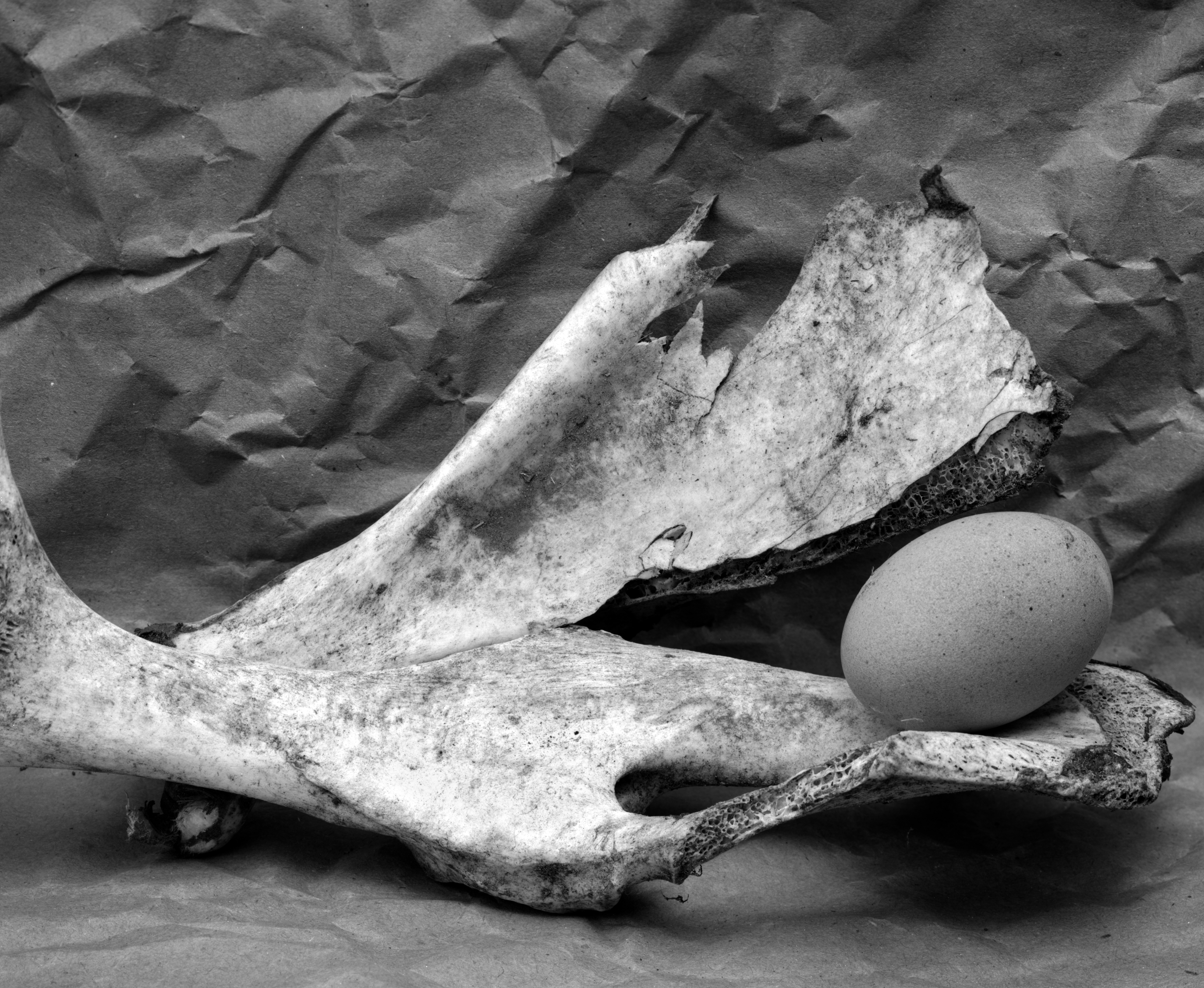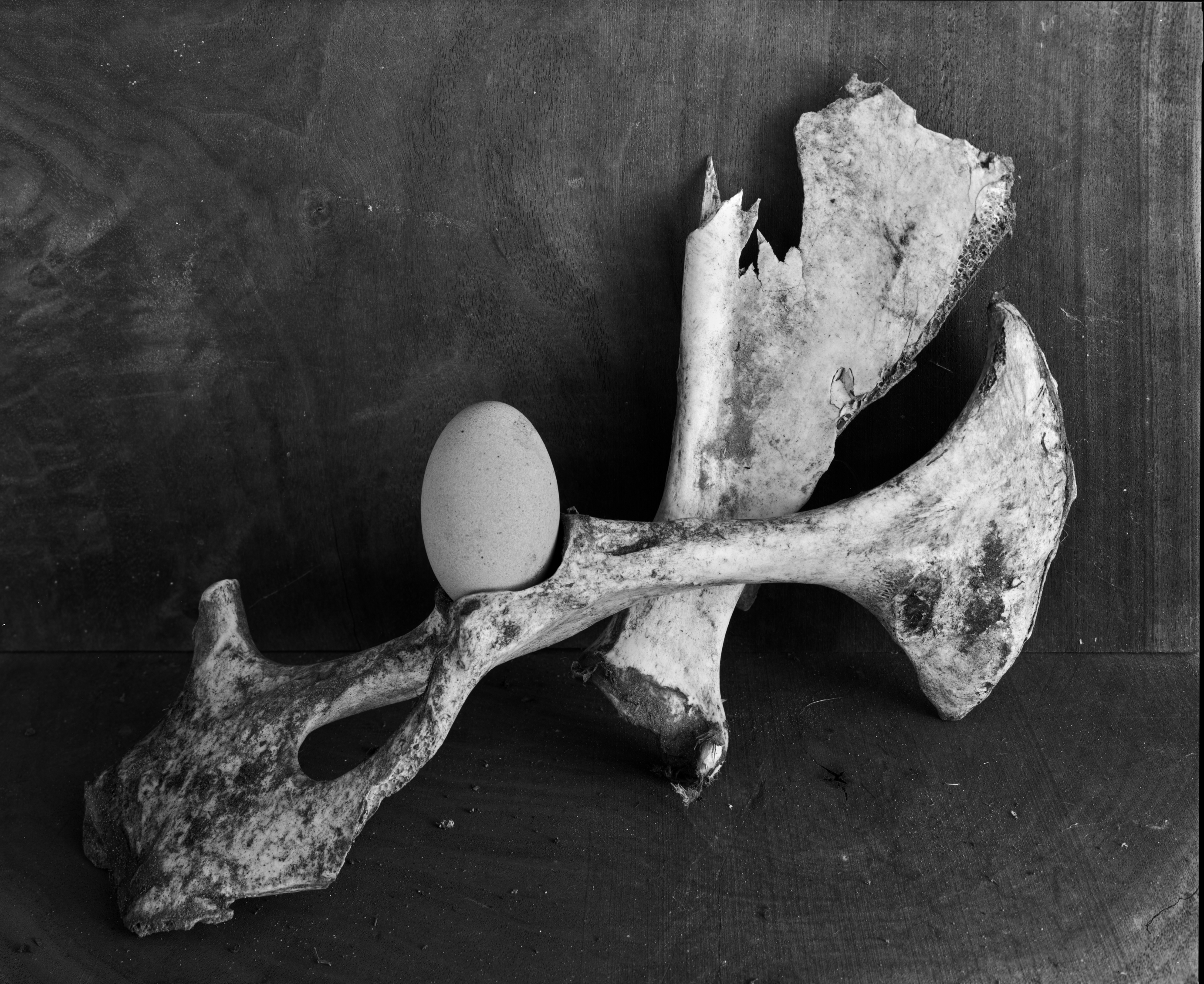 Bones and egg. Fp4 @ 80, pyrocat MC, f64.Lighting lacks the strongly luminous effect I have been trying to achieve with my still lifes lately. There is some there, but not as much as I want. I think I would have liked more shadow on the left side of the egg as well. The seperation between the background and floor is annoyingly distracting, and I will need to fix that. May look for wood with simpler grain that is slightly darker than the pieces I am using right now.I suspect that a contact print will improve the overall "look" of this image compared to a scan.Thoughts?