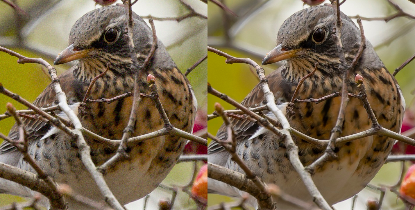 This is getting funny.>>4476583>>4476598I wouldn't call proving someone wrong as them bullying me, but sure.Let's see if I can bully you into proving me wrong.>A photo from someone who clearly wants detail, killing that argument completely.I denoise images because I want them to have less noise, not additional details, in fact I'm fine losing a bit of detail if it means all of this disgusting-looking noise goes away with it. And the reason I consider noise disgusting is because it's not a natural thing, it wasn't there, it adds nothing to the photo except making it look unnaturally coarse and doubles the file size in the process. The only reason I can think of why someone might want to keep it in is because they have some perverse nostalgia for "noisier days" when you had no options but to live with it. And can you make up your mind, do all of the fake feathers "immediately jump at you" or is there not enough difference to even notice? Here, since you are an expert ornithologist, and like to look at photos at full resolution (which totally isn't pixel peeping).Can you point out those fake AI feathers that jumped at you? Or the ones that are so thicc they basically constitute a different species?Lets measure them in pixels. >>4476602The only sliders moved here are WB (+200) Exposure (+0.5) and in one of the images - Denoise.No presets applied.