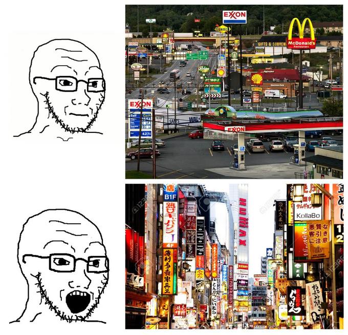 Agreed, but I wanna add that what makes Japan aesthetically interesting is their priority on the little things. In America, Europe, and China, there tends to be more effort into making things look cool based on how important they are, but Japan is weird because they just try to make everything look kinda interesting, even if it doesn't matter. Actually, I think if you're not a visually perceptive person, this aspect of Japan becomes invisible, which is why the whole "thing: Japan" meme became so popular. You won't notice for instance that Japanese cities are unusually geometric (including the cars), that they are strikingly clean, that they're made of very expensive materials on average (like ceramic exterior tiles which are very expensive to clean) and wood which is chosen specifically because it ages beautifully.