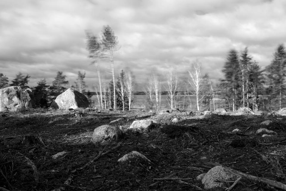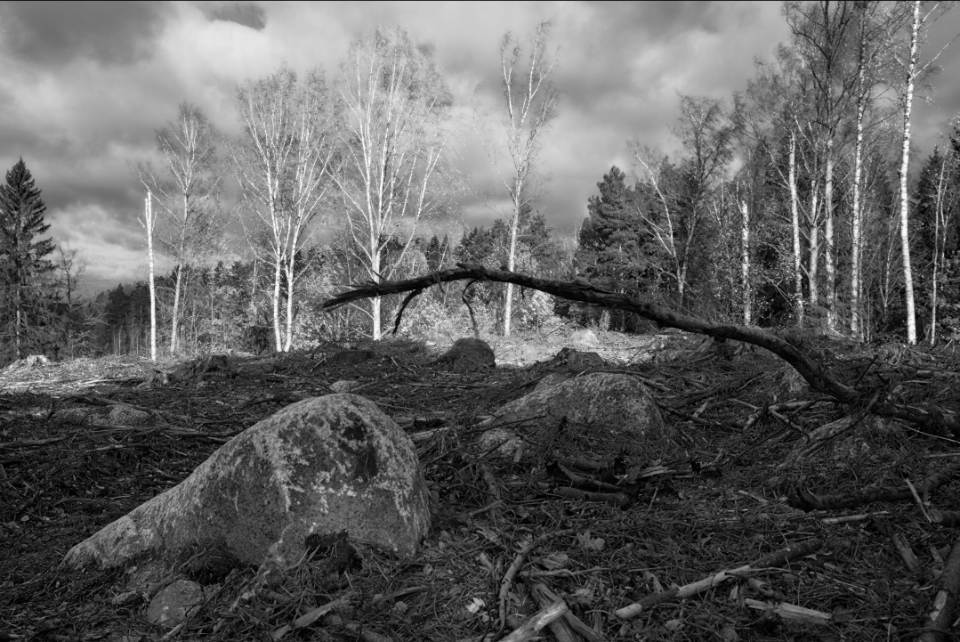 It is quite obvious how diagonal lines are used. The center horizon makes it harder for the eye to rest, making the image more nervous. This may very well be intentional, given the subject matter. In both pictures, shadows are used to separate the foreground from the middle/background, where there is a strong contrast between the trees and the clear-cut. In the second image, the almost dead center horizon with the second horizontal line right by it, with the high-key trees force your eyes to look there but the diagonal light still leads the viewer comfortably towards the foreground.