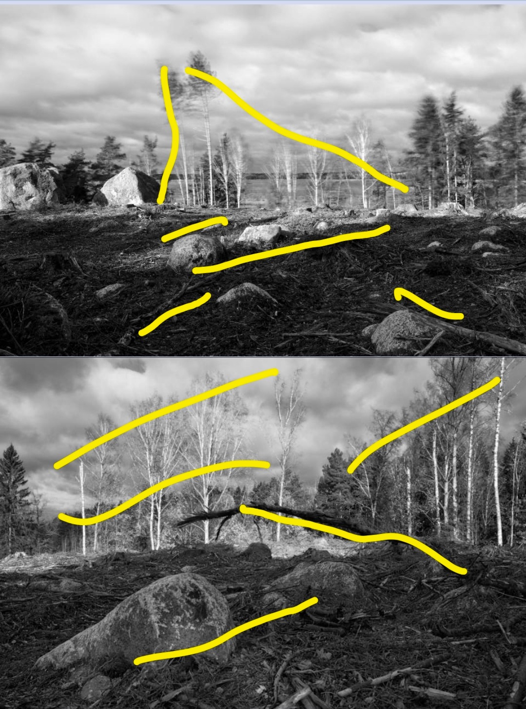 Perhaps it is stretching things a bit, but there the trees in the upper one seem to imply some vague triangle which stops the sky from being blocked too hard while guiding the viewer across the center. The rhythmic nature of the vertical elements also help the viewer orient themselves sideways.