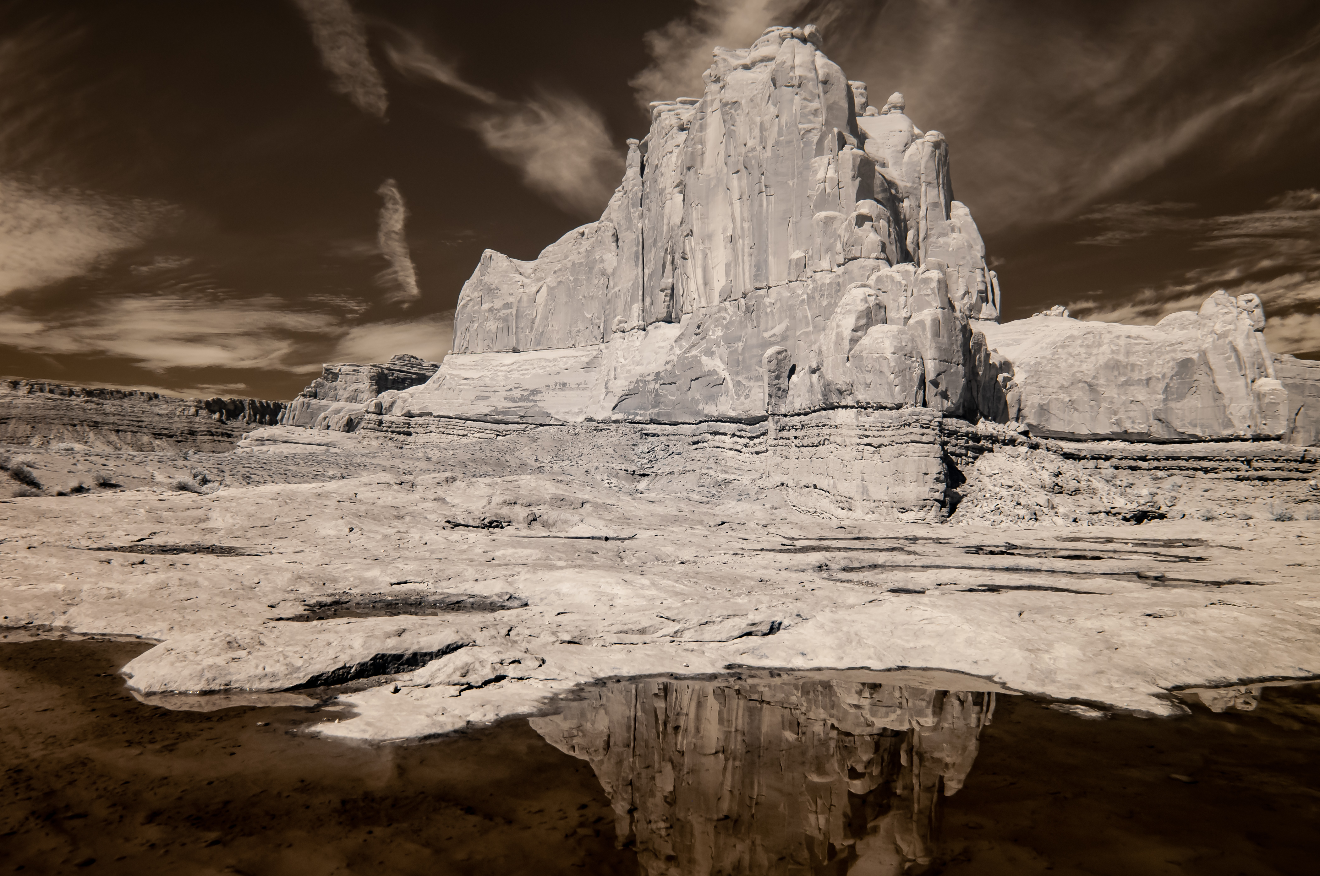 >>4501747Straight out of the camera. -1 stop exposure in camera, turned the highlights down a bit and that's more or less it. Small amount of clarity to bring out the rock texture.This shot was done on a D300 with IR conversion and I can't remember the specs right off but thats what everything looks like coming out of it. I used a 200-500/5.6 and set it to f/16 and guesstimated the hyperfocal on it and managed to nail it.I am very much in love with the D300 setup, enough that I bought my first DX lenses in years. A lot of the IR stuff out there looks cartoonish, I wanted something that could easily be converted to BW. You can get my setup with any other camera or sensor of choice, the difference is the filter in front of the sensor.